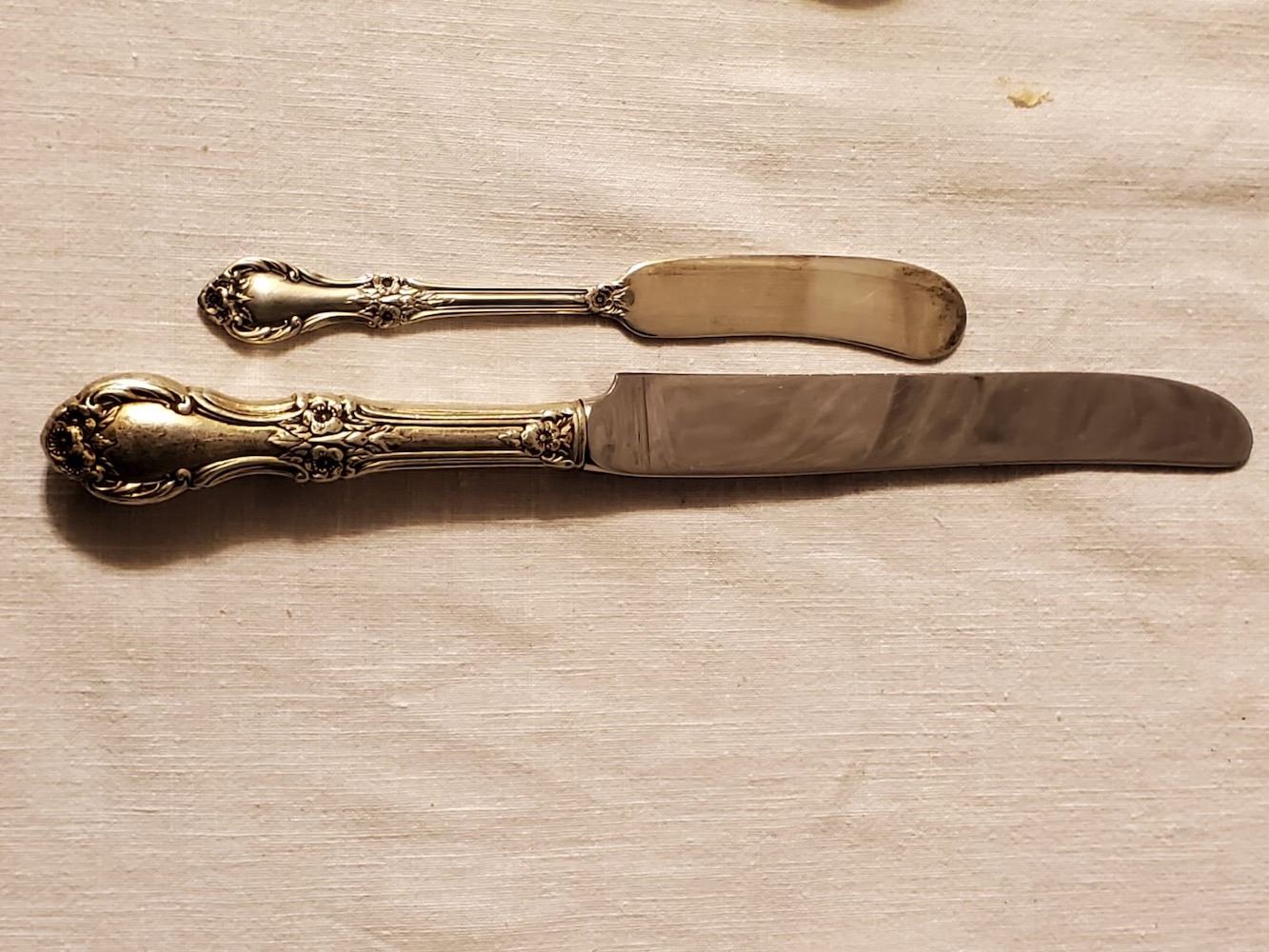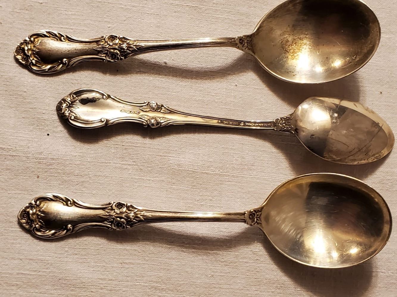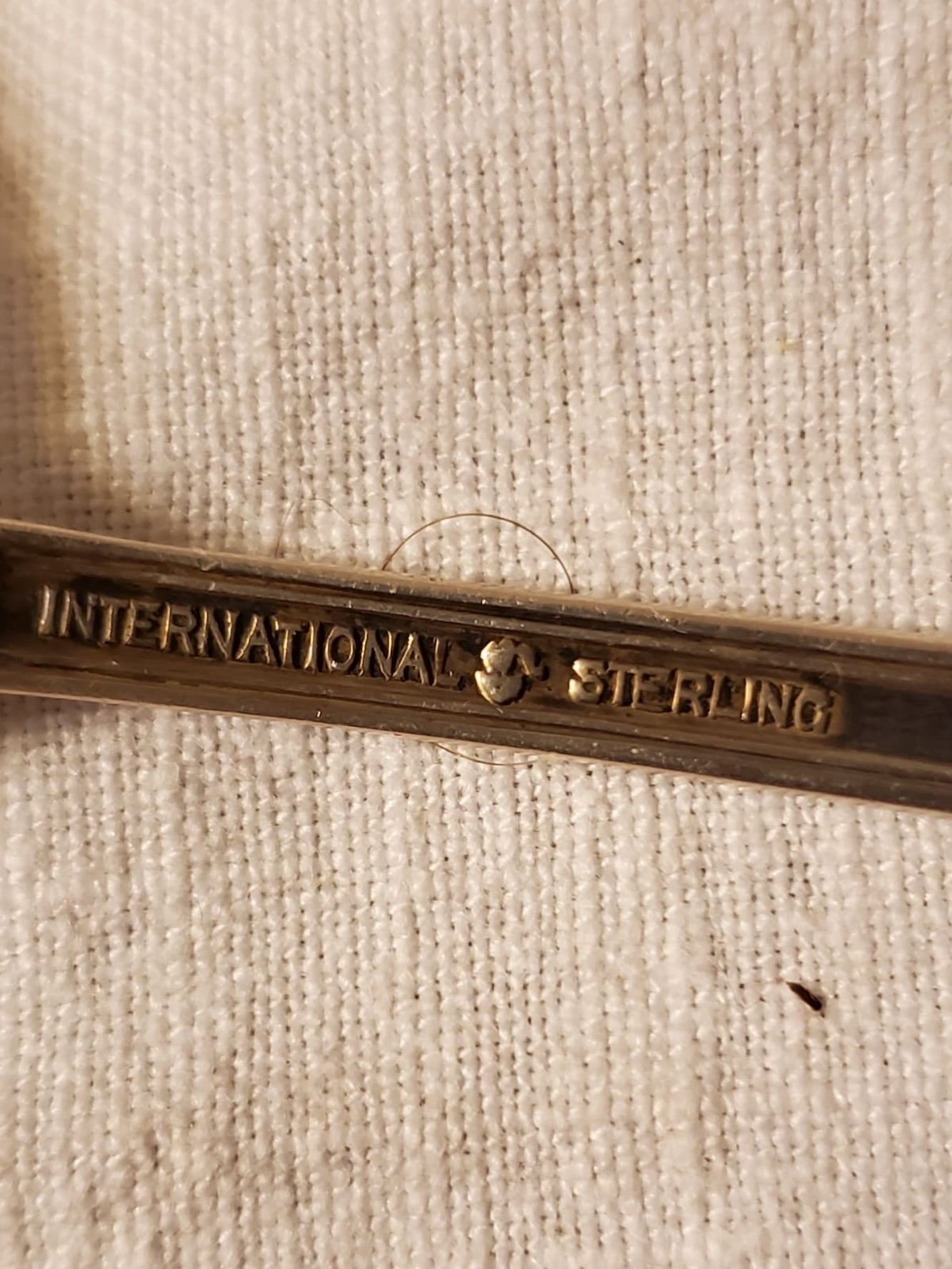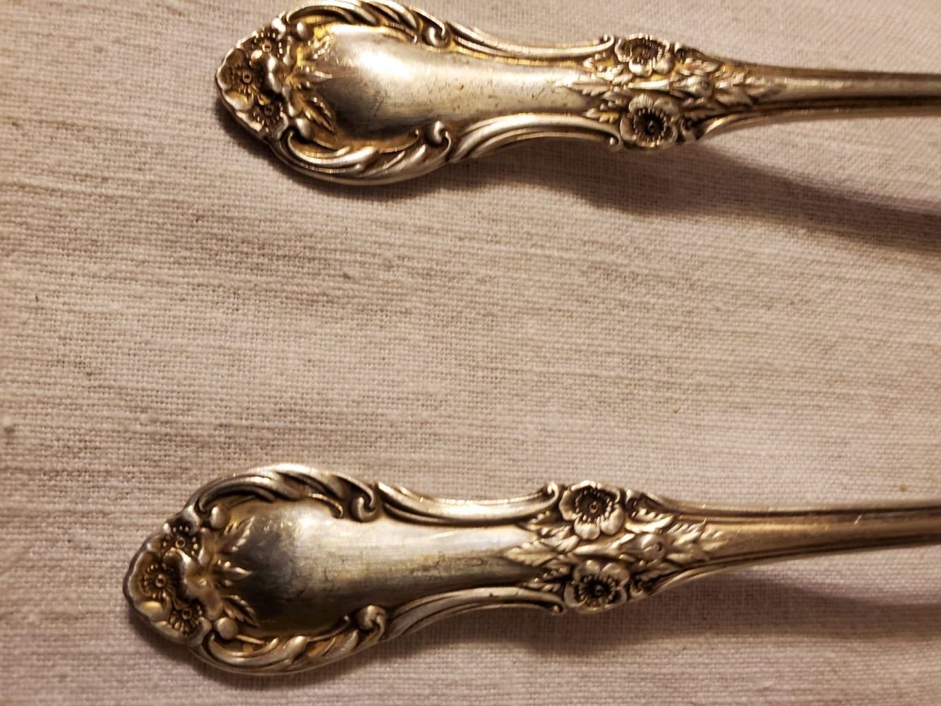 International Sterling, Wild Rose Pattern, one teaspoon, 2 soup spoons butter knife, knife, 2 salad forks, and fork.
