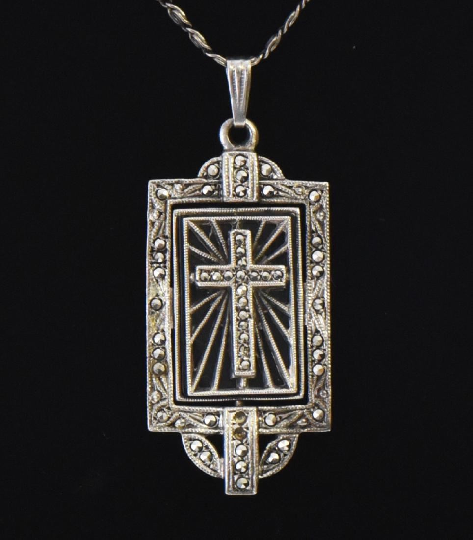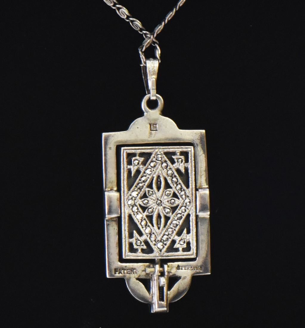 Sterling Silver "Flip" Pendant with Marcasite Stones and Sterling Silver Unique Chain. This pendant flips vertically to display two different designs using a spring loaded flip lever. Stamped "925" "LS", "Patent" Base Stand Not Included. Estimated more than 100 yrs old. 925 Sterling Silver consisting of 92.5% silver and 7.5% copper. Tested Positive using Nitric Acid Chemical Scratch Test, Cloth Rub Test, Smell Test, and Magnet Test. Markings of 925 or Sterling stamp. The reason silver needs to be combined with other metals is that it is very difficult to make great designs with just pure silver, which is very soft and malleable. A bit of hardness has to be introduced by adding other metals such as copper. That is why jewelers are capable of making the most intricate an complex designs with 925 Sterling Silver. Silver is one of the most valuable elements next to gold. Mexico is the leading producer of sliver, followed by the United States, Canada, Australia, Spain, Peru, and Russia. Many countries do not require their precious metal items to be stamped and therefore we test to ensure we accurately represent the product. Size: See Ruler Photo. (Photos Represent The Condition Of The Lot.)