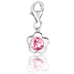 A nature themed flower charm accentuated with a gorgeous center pink tone crystal stone. Clasps to a bracelet with the featuring lobster lock.Rhodium Polish: NoLine Item Type: SilverMetal Name: Sterling SilverMetal Content: 925Style Name: CrystalLength: 1.13 iWidth: 0.50 i