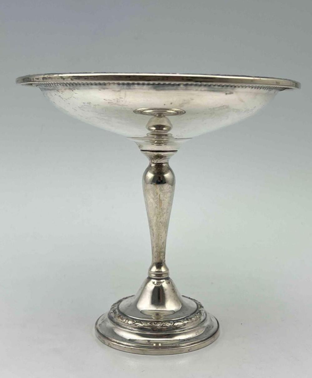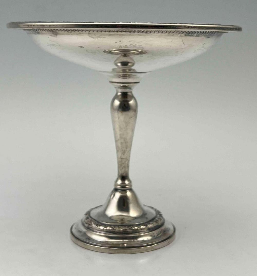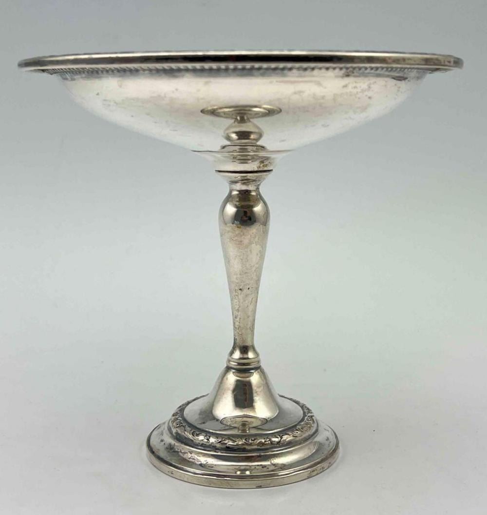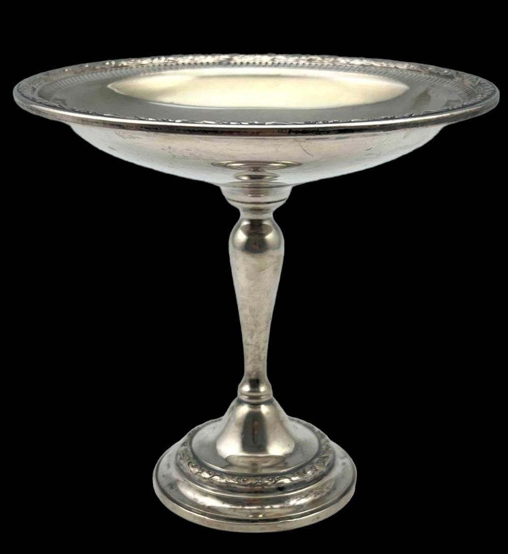 Sterling Silver Footed Compote With Floral Motif. 221.9g. Marked Weighted Reinforced Sterling PT36. Approximately 5.75H x 6.0W in. ALL CREDIT CARDS WILL BE MANUALLY VERIFIED PRIOR TO SHIPMENT.