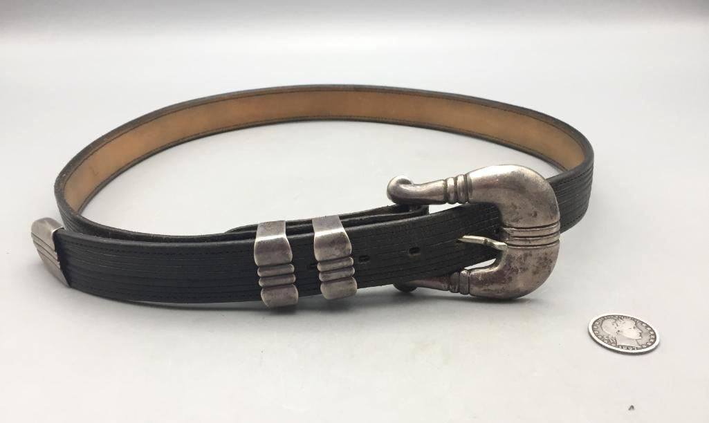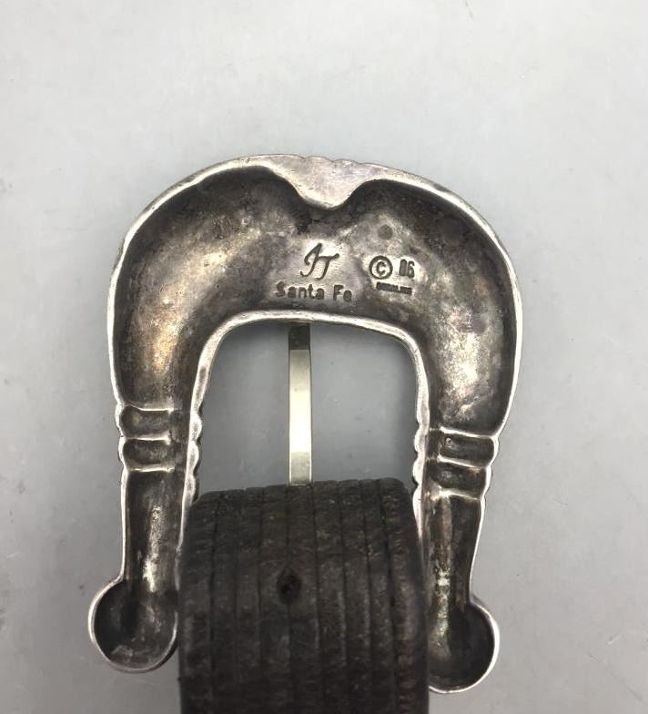 Description: For sale in this lot is a sterling silver four piece buckle set with the belt. This is a simple yet classy sterling silver buckle with a nice leather belt. Marked as sterling silver. Maker: Hallmarked JT Santa Fe. Approx. Age: Fairly modern. Size: Belt measures 40 inches long overall. Buckle Measures 2-5/8 inches long X 2-1/4 inches wide. Weighs 177.5 grams. Condition: Good for their age, normal wear expected. Please look closely at the pictures - they are an important part of our description. Shipping: There will be a $5 handling / packaging fee for shipping this lot. The actual cost of postage will be added on top of that.