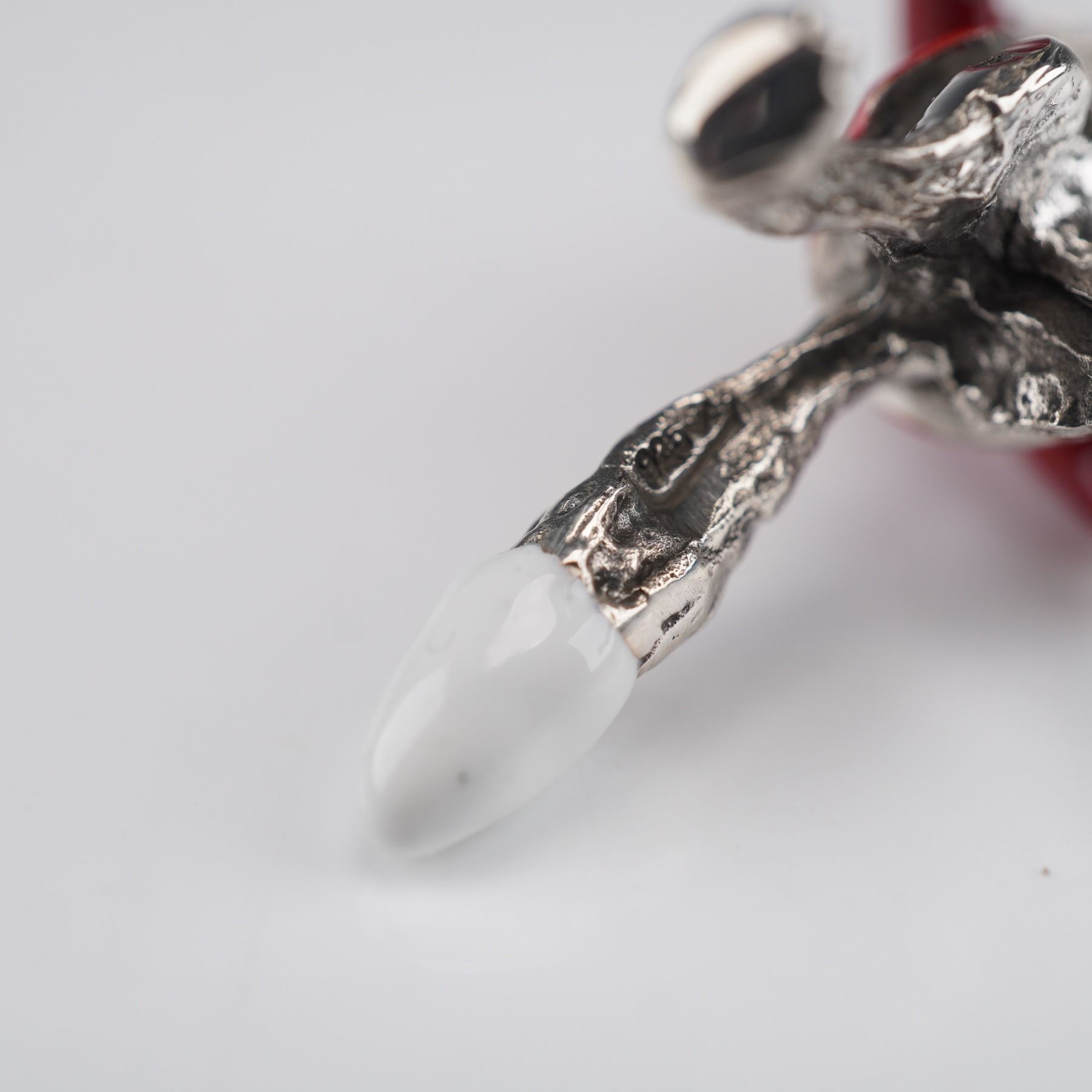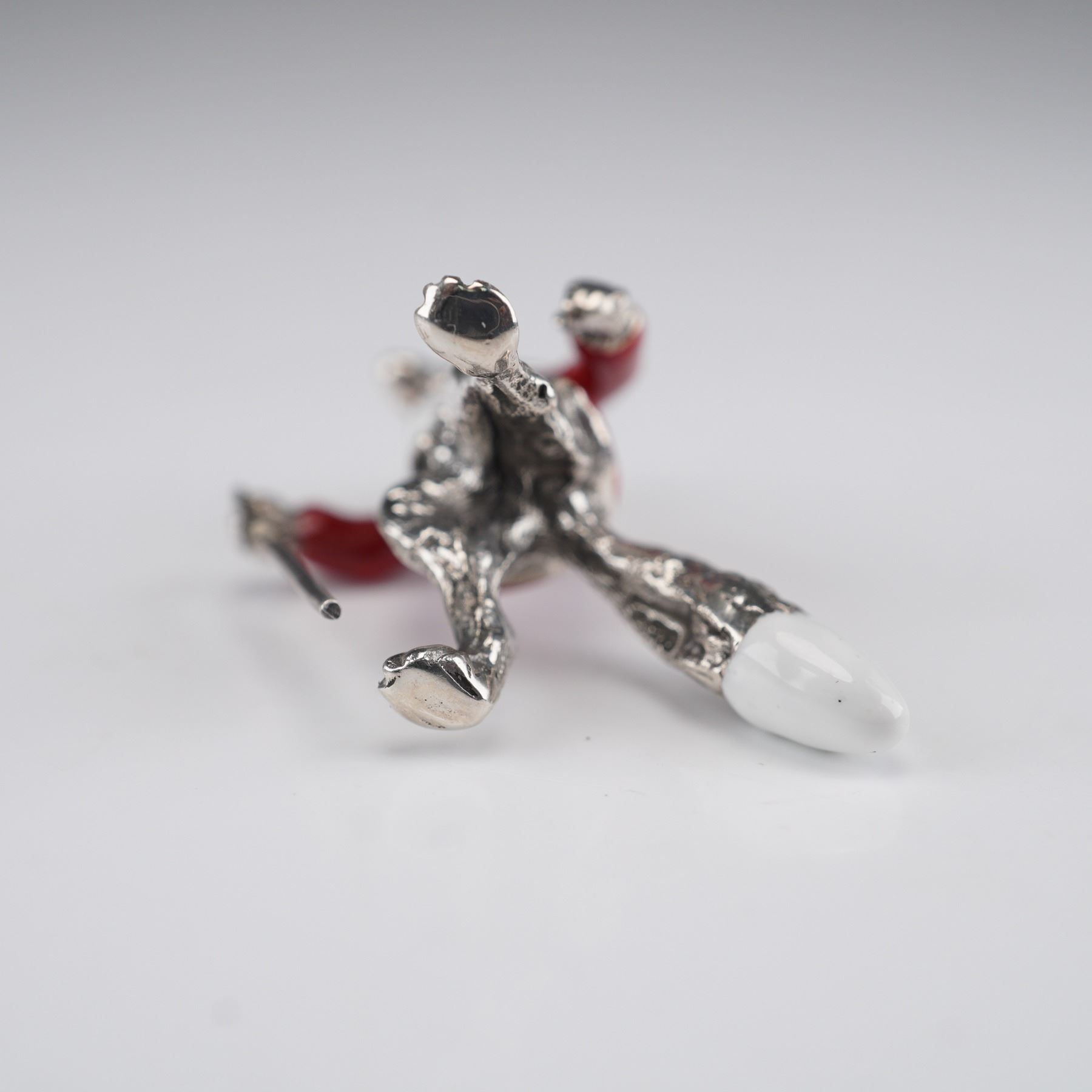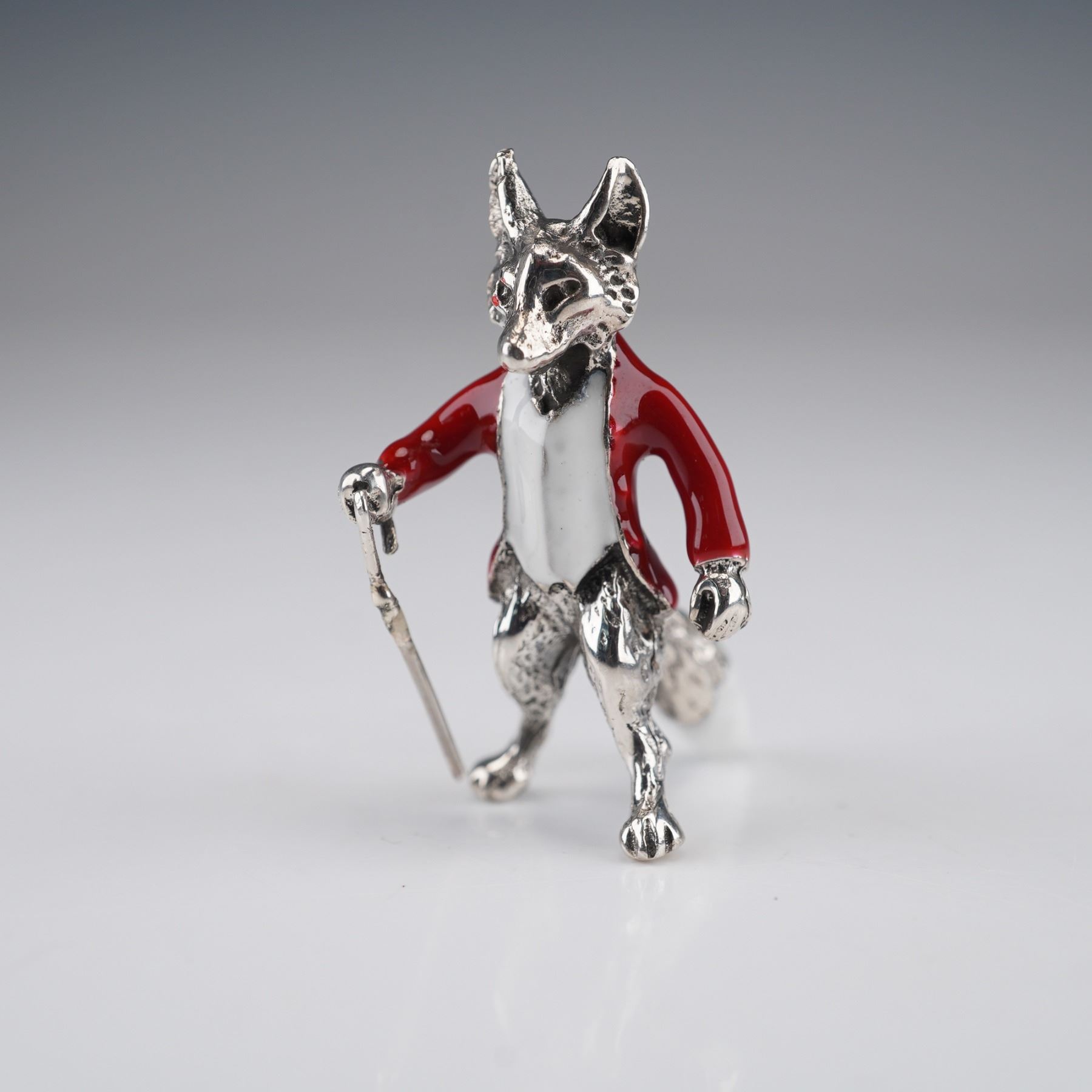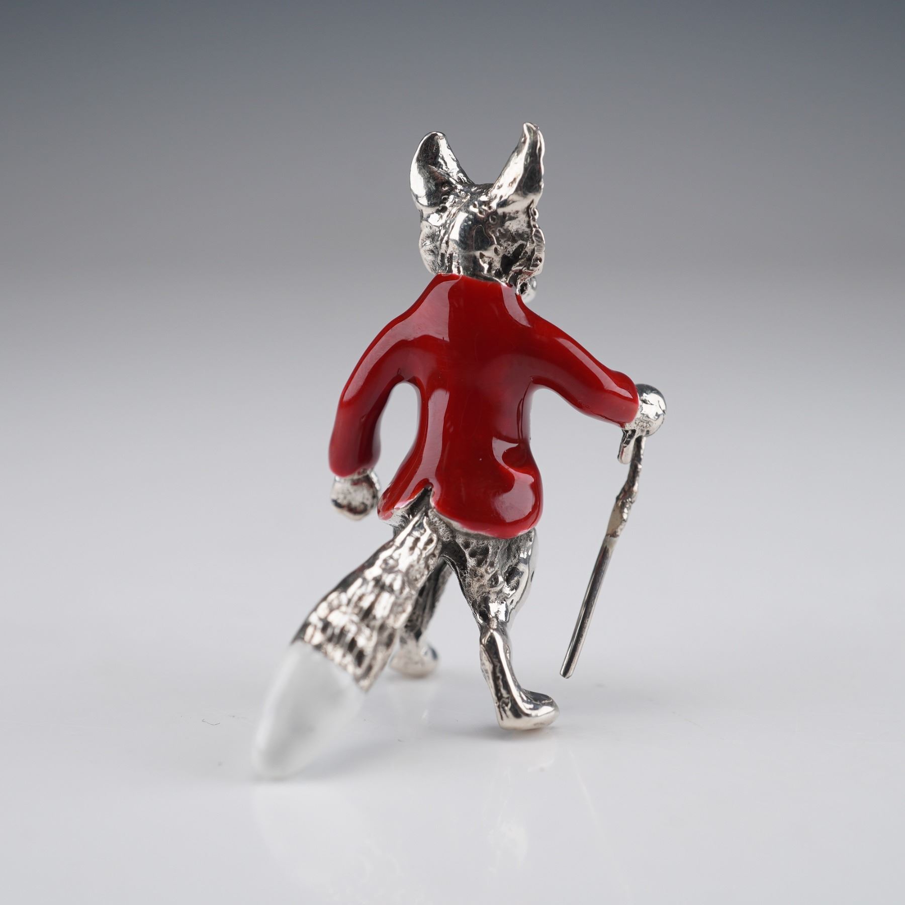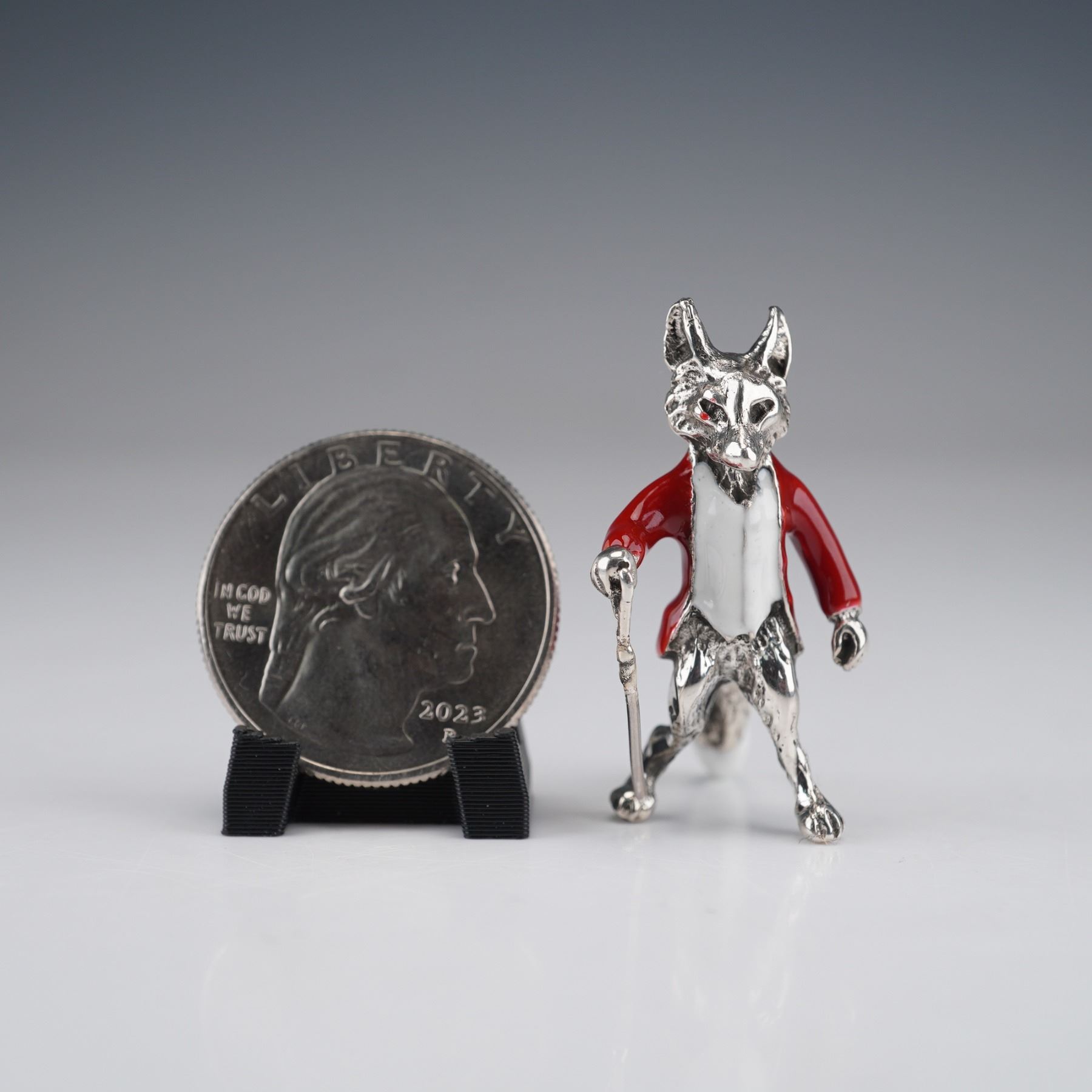 This sterling silver miniature fox stands upright, wearing a red enamel coat and white enamel shirt, with a sterling silver walking stick in its right paw. The detailed figure features textured fur, a bushy tail with a white enamel tip, and a free-standing design. "925" is embossed under the tail, indicating its sterling silver composition. No maker's mark is visible. Overall weight: 0.42 oz.