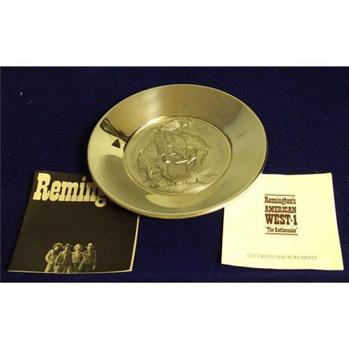 Outstanding sterling silver Fredric Remington "The Rattlesnake" commemorative charger with a high relief depiction of the cowboy being bucked up by his horse being startled by the rattlesnake, the verso has a high relief depiction of a Native American Indian beholding a horned animal skull to the which reads Geo Washington Min Inc "First Year of Issue 1972 Reg# 6392 Sterlingheavens and also has a side profile with titled Fredric Remington under which is a plaque ". The plaque comes with original documentation explaining the work, along with the original certification papers and the dust/tarnish guard. The plaque measures just over 10 inches in diameter and weighs an impressive 695 grams (24.5 ounces or 1.5 pounds). It has a very weighty feel in the hands and would make a special gift for the Remington or old West enthusiast.