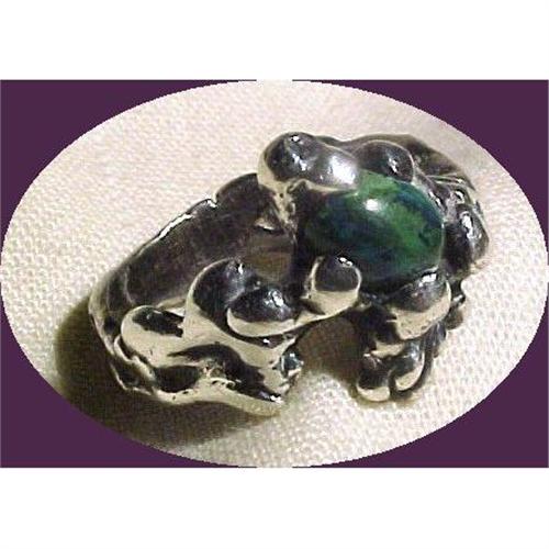 Very nice heavy sterling free form desing ring with a semi-precious green & blue gemtone cabochon called Azurite. The ring size is 7 1/2. The sterling show a tad bit a darkening from the patina that can be easily polished up if you so desire. This beautifully unique interesting ring is in excellent condition.