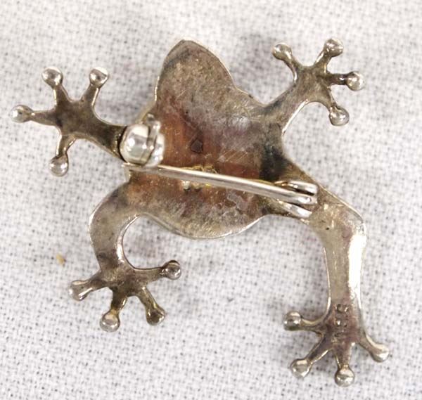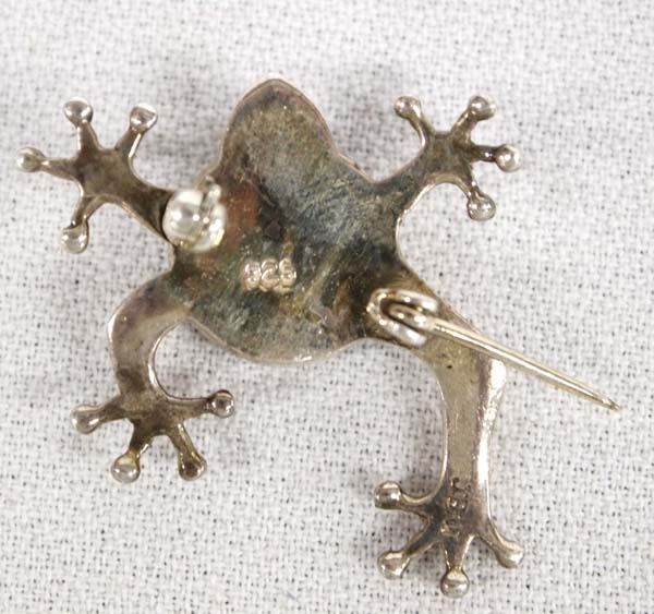 Sterling Silver Frog Pin, he looks like he's dancing, all sterling silver set with jade green cabochon, measures 1.25'' x 1.25'', 7.2g in total wt.