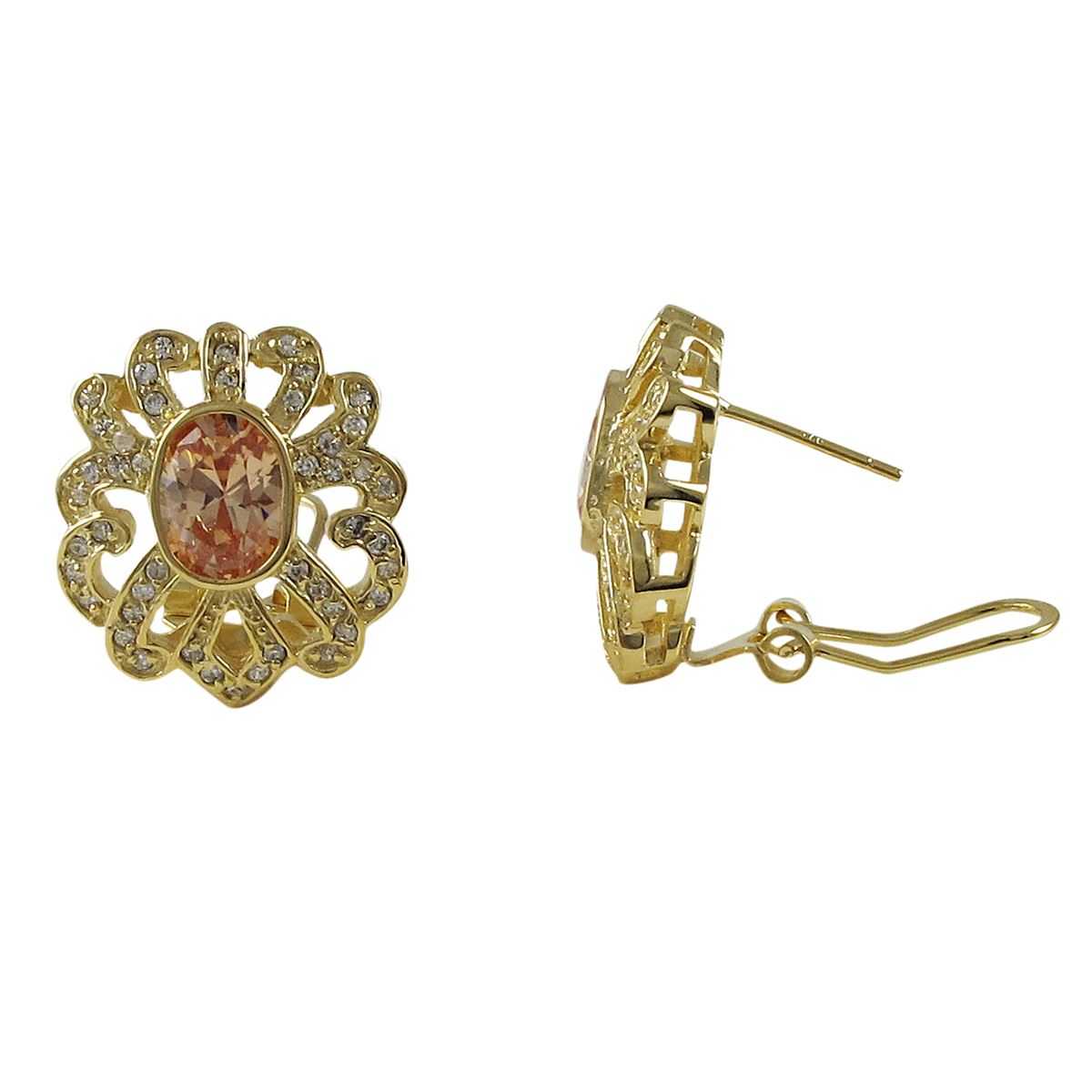 Sterling Silver Gold Plated CZ Earrings With Champagne Center CZ. Omega Clip Back (Clip And Post).