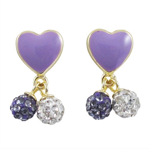 Sterling Silver Gold Purple Enamel Heart With 2 Crystal Balls Earrings
