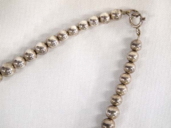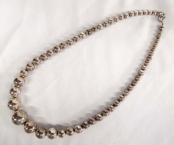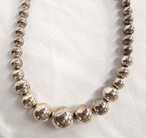 Elegant Sterling Silver Graduated Bead Necklace, measures 20'' end to end, largest bead measures .75''D, graduated in size from .5mm to 15mm, beautiful all sterling silver beads, looks great with turquoise jewelry, 50.49g in total wt.
