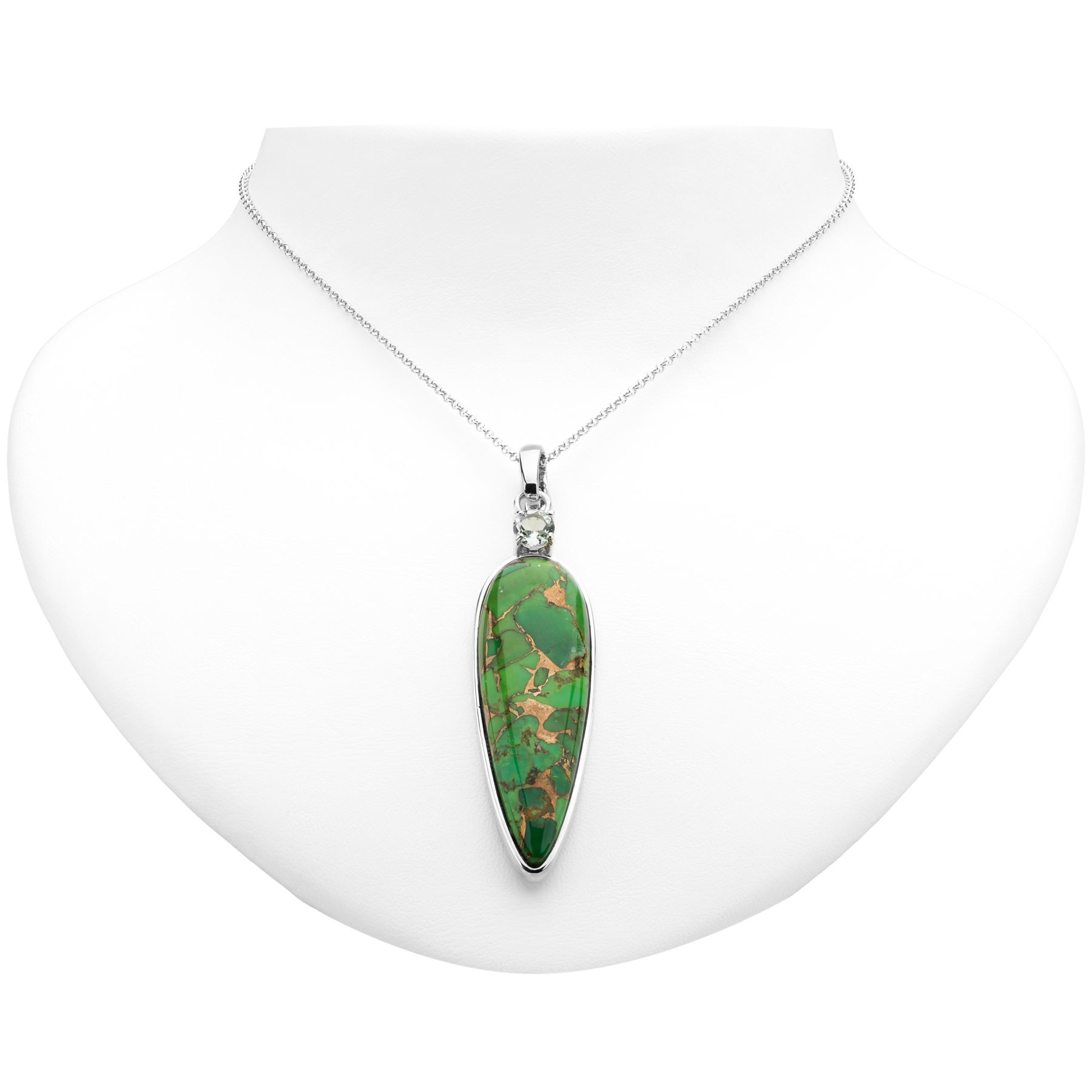 This finely crafted Sterling Silver pendant features a dramtically elongated pear shaped Kingman Green Mohave Turquoise cabochon at the center of the pendant.A sparkling cut peridot gemstone compliments andpunctuates the top. The beautiful bronze metallic matrix running through the Turquoise ignites a sense of wanderment and luxury! Sleek and chic, the chain threads the bail and youre all set. Mohave Green Turquoise/Prasiolite: