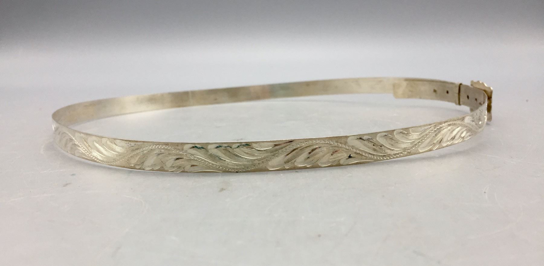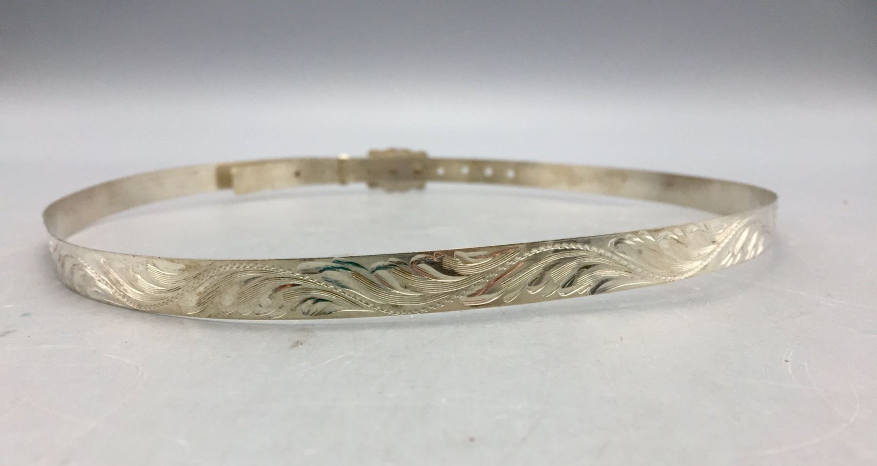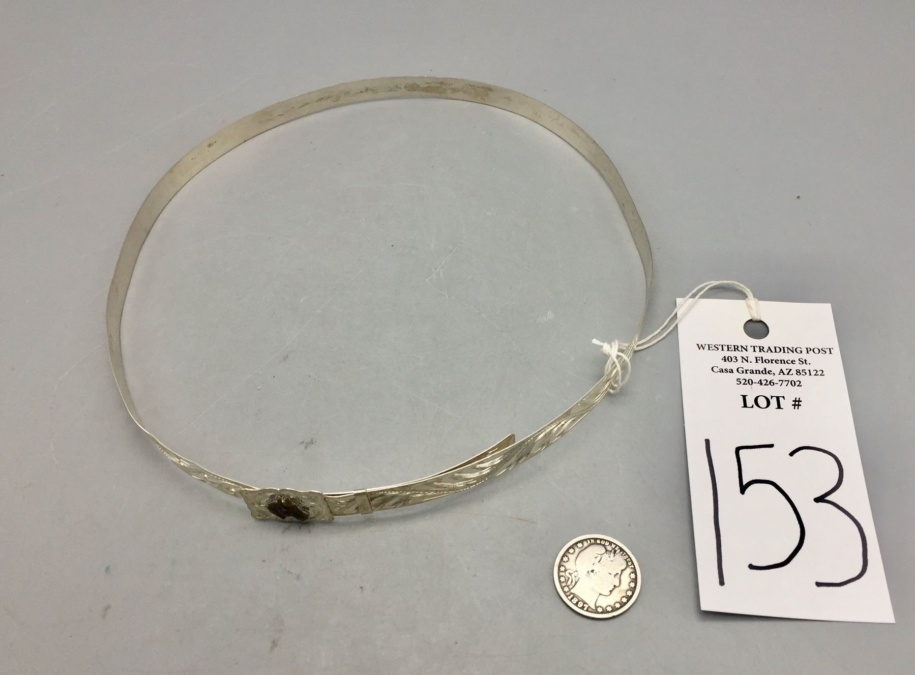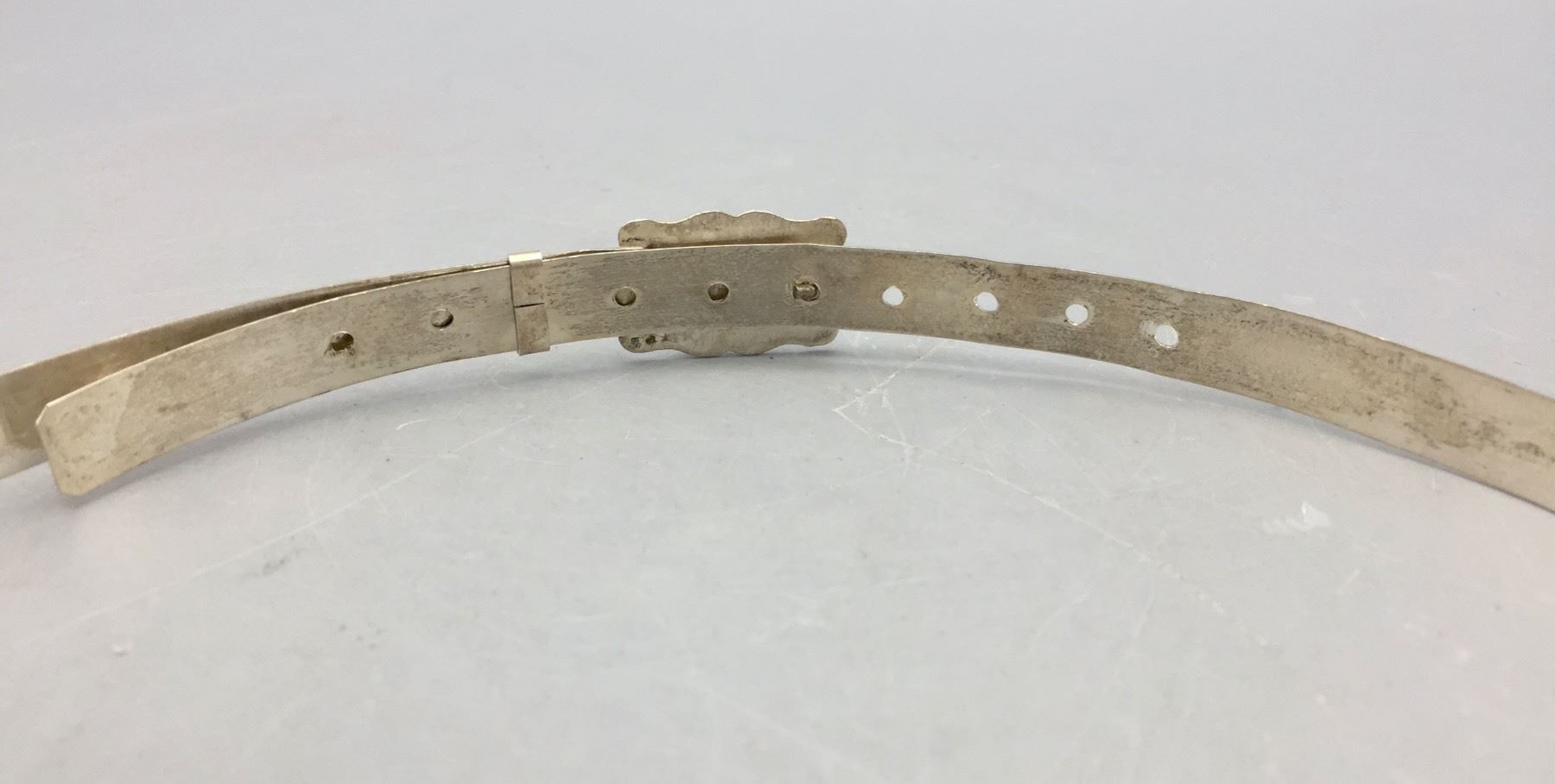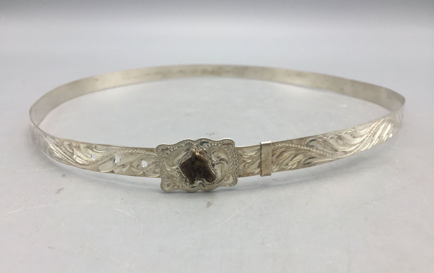 Description: Presented for sale in this lot we have a neat sterling silver hat band featuring engraving with a brass horse head on the buckle. Maker: Diablo. Approx. Age: Vintage. Size: 23 inches around, adjustable. Condition: Good for its age, normal wear expected. Please look closely at the pictures - they are an important part of our description. Shipping: There will be a $5 handling, packaging fee for shipping this lot. The actual cost of postage will be added on top of that.