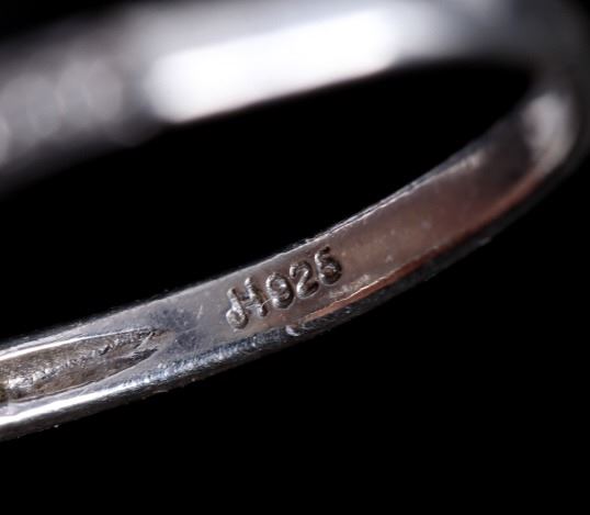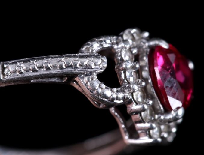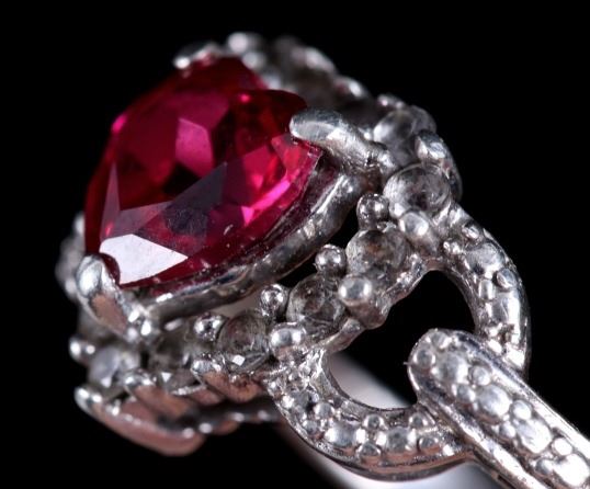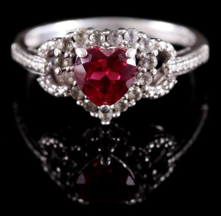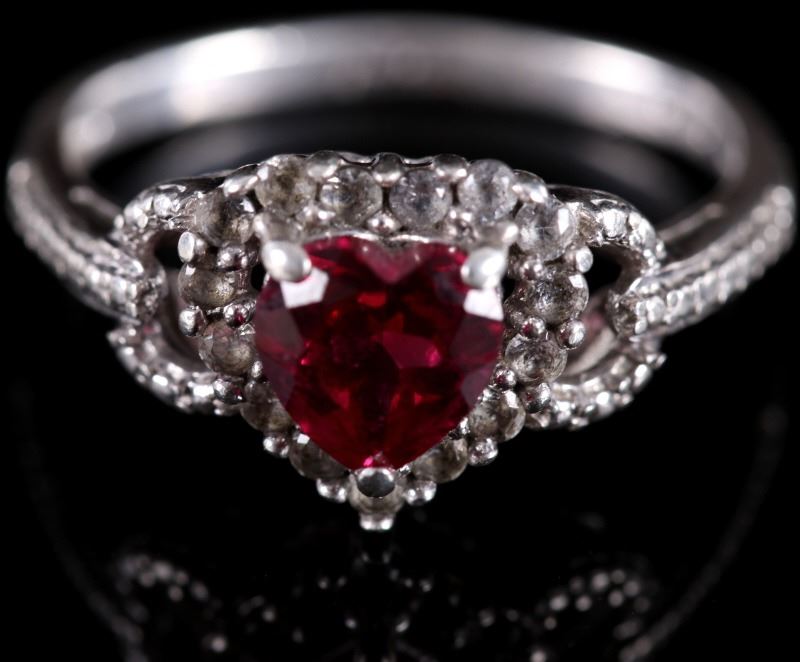 For sale in this lot is a sterling silver, heart cut ruby, and diamond ring. The ruby is encircled with fifteen diamonds, and has an intricately tooled band. The inside of the band is marked "925" indicating its sterling silver purity. Overall, the ring shows good condition, with tightly set stones, and a bright silver finish. The ring measures to a US Size 6 1/2.