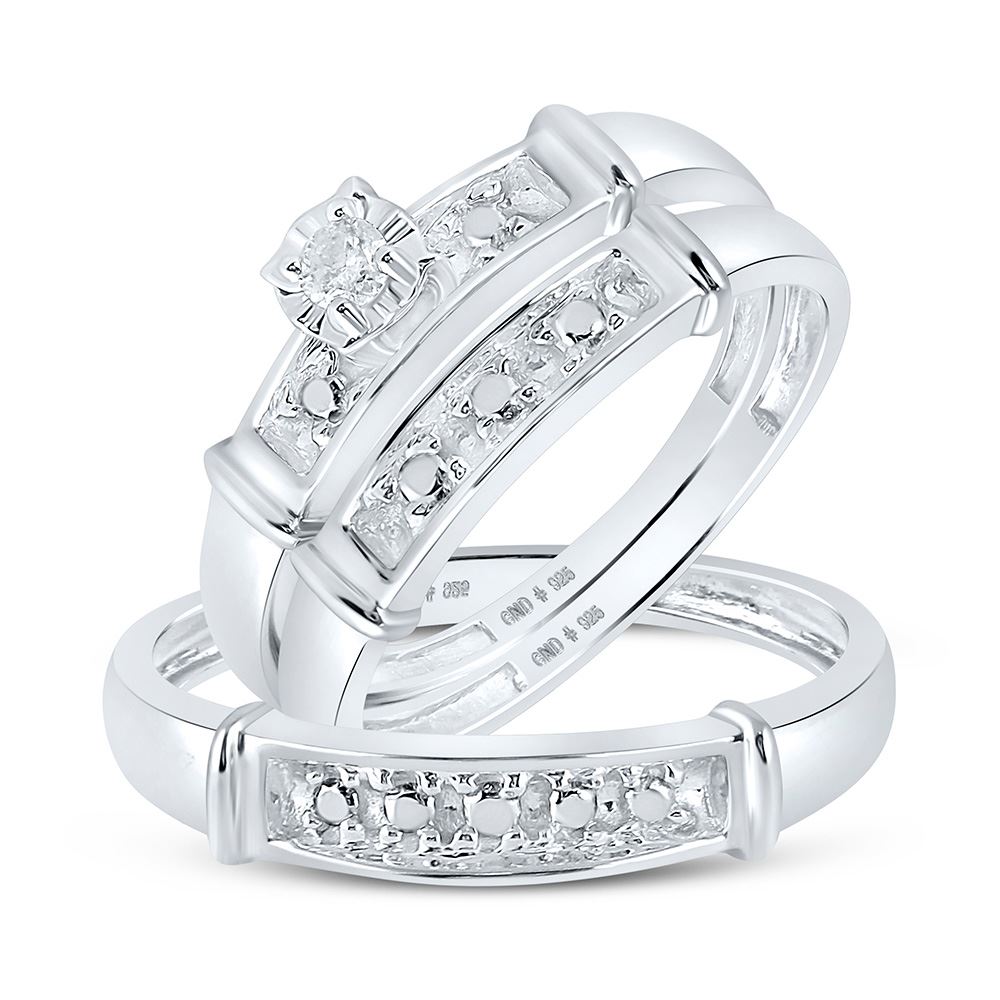 Sterling Silver His Hers Round Diamond Solitaire Matching Wedding Set 1/20 Cttw