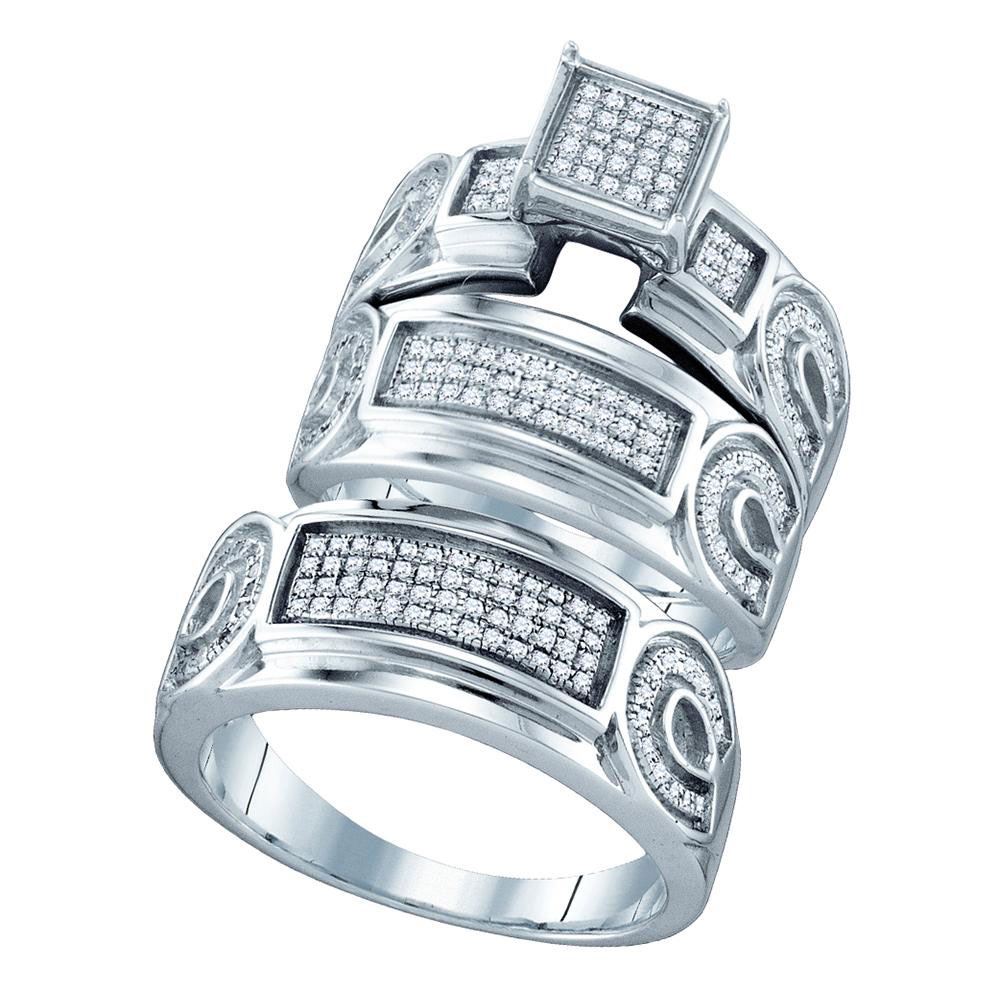 Sterling Silver His & Hers Round Diamond Cluster Matching Bridal Wedding Ring Band Set 1/2 Cttw