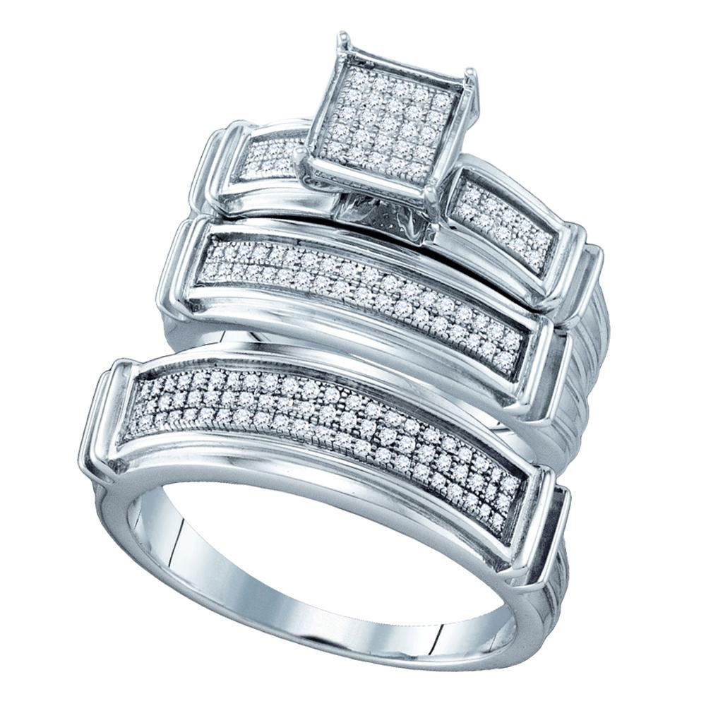 Sterling Silver His & Hers Round Diamond Cluster Matching Bridal Wedding Ring Band Set 3/8 Cttw