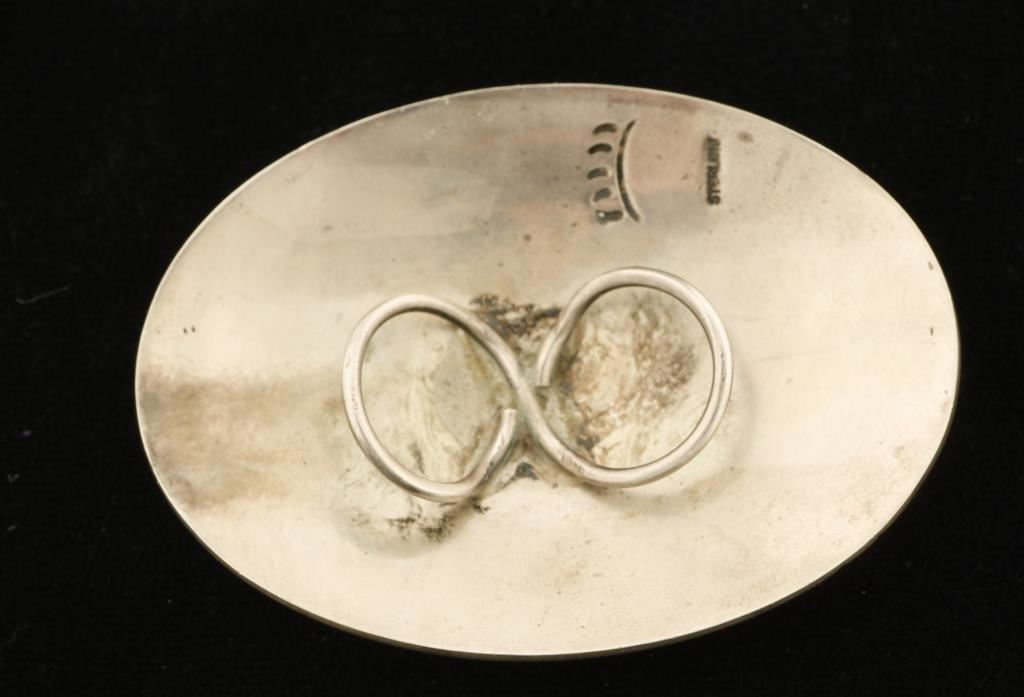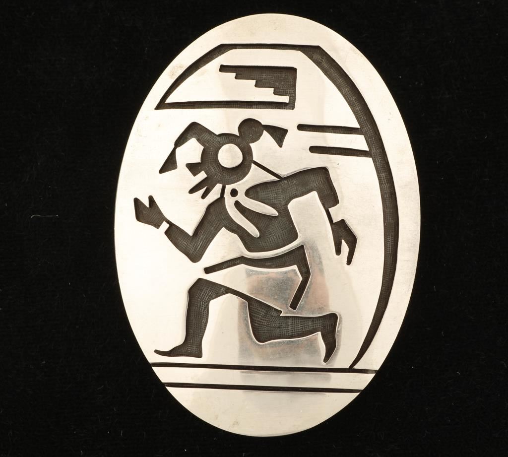 by Riley Polequaptewa. The Hopi's are known for their exquisite overlay work that display many symbols of their culture. Riley is a member of the Bear Clan and has been making jewelry since 1972. The pendant measures 2 1/2" in length and 1 7/8" wide. It is hallmarked with a bear paw print (Riley's hallmark) and 'Sterling'.