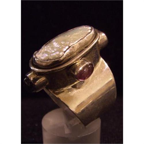 This is a real eye catcher. This ring was handmade for this beautiful large abilone. It is bezel set and set off with two cabachon raspberry tourmalines and two cabachon green tourmalines. The total carat weight is approximately 8 cts. The ring is 12.3 grams.