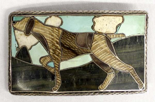 Sterling Silver Inlay Belt Buckle, measures 4'' x 2.5'', stamped hand made sterling, bird dog motif, over 100g in total wt.