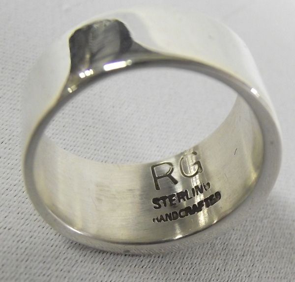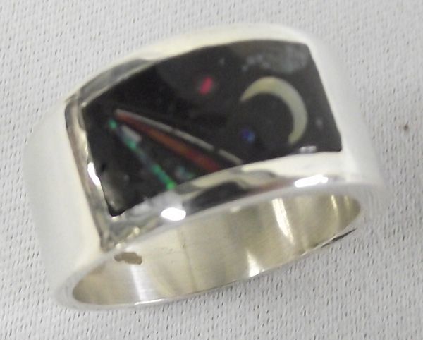Sterling Silver Inlay Ring. Beautiful band ring with inlay night sky design with stone to stone jet, abalone, turquoise, mother of pearl and other stone. The inlay has been reinforced in one corner. On the inside of the ring, the artist's hallmark is stamped, ''RG'' and ''Sterling Handcrafted.'' The ring is size 10.5 and is 1/2'' wide and the thickness tapers from 1/8'' at the top (at inlay) to 1/16'' at the bottom.
