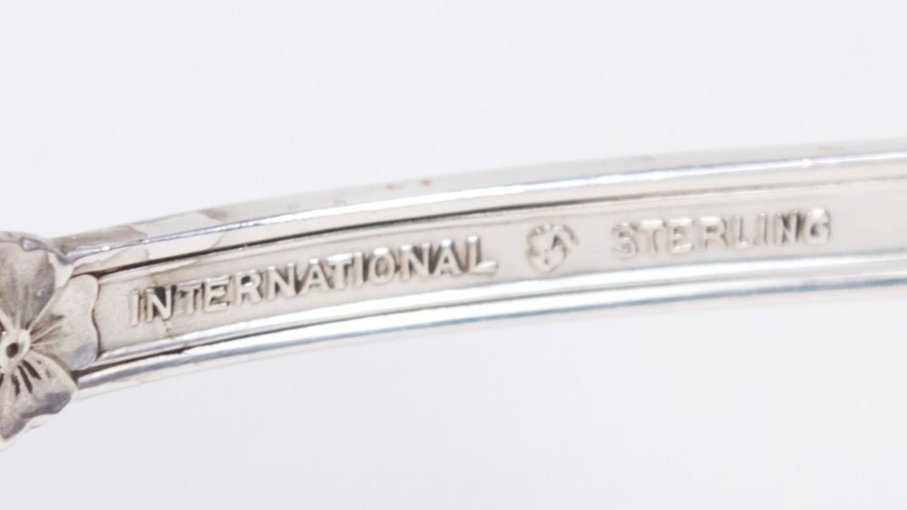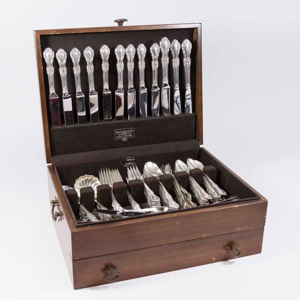 Wild Rose pattern. Including 12-7 1/4" forks, 10-6 5/8" spoons, 22 teaspoons, 12 dessert forks, 12 olive forks, 12-5 7/8" butter knives, 12-9 1/4" knives, and 5 serving pieces. Total weight approx. 92 ozt (2551 grams) plus knives. (6085)
