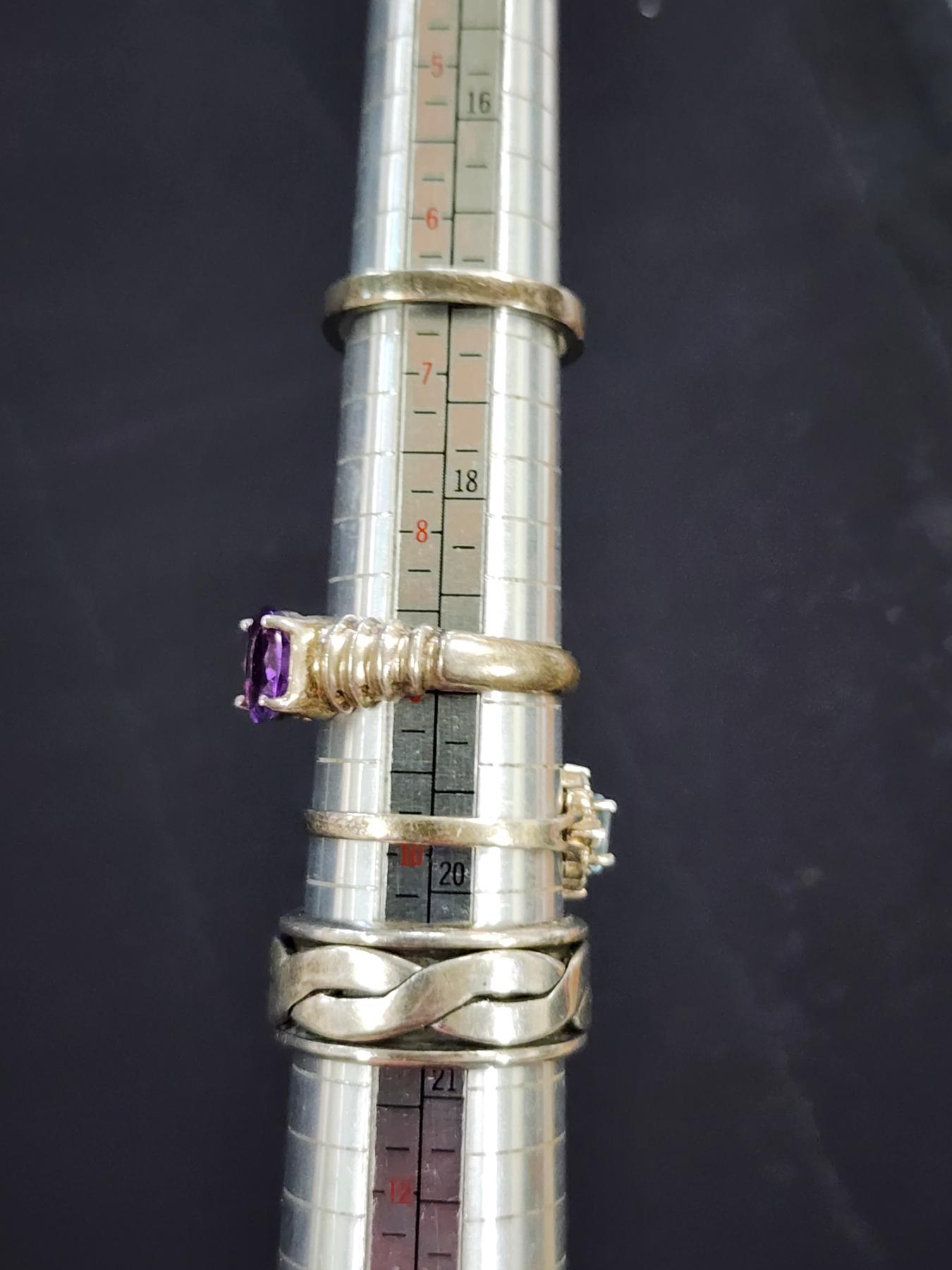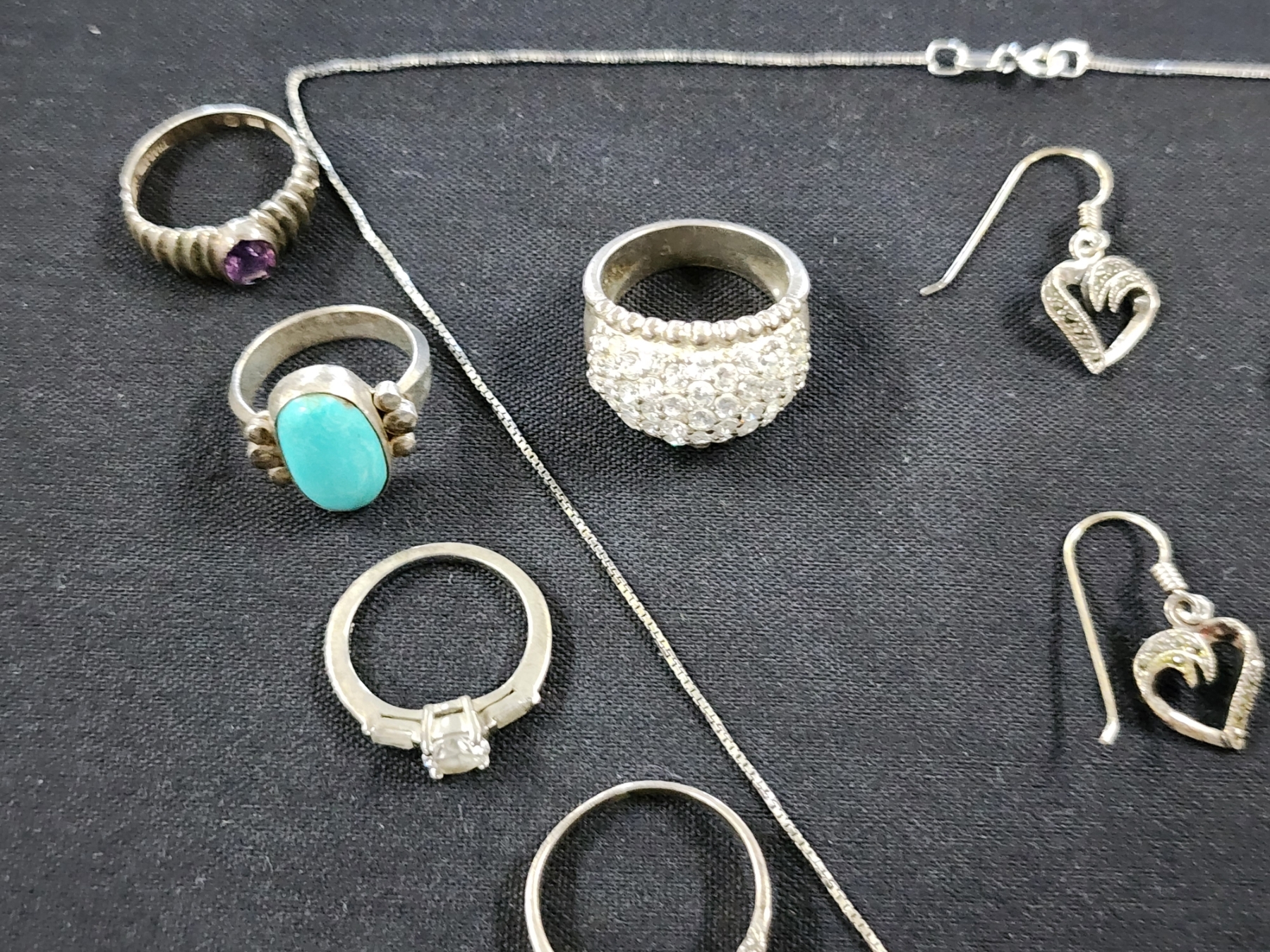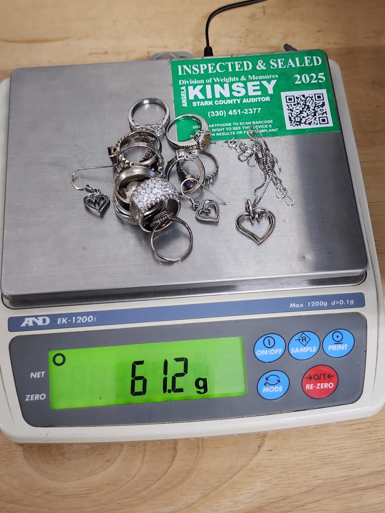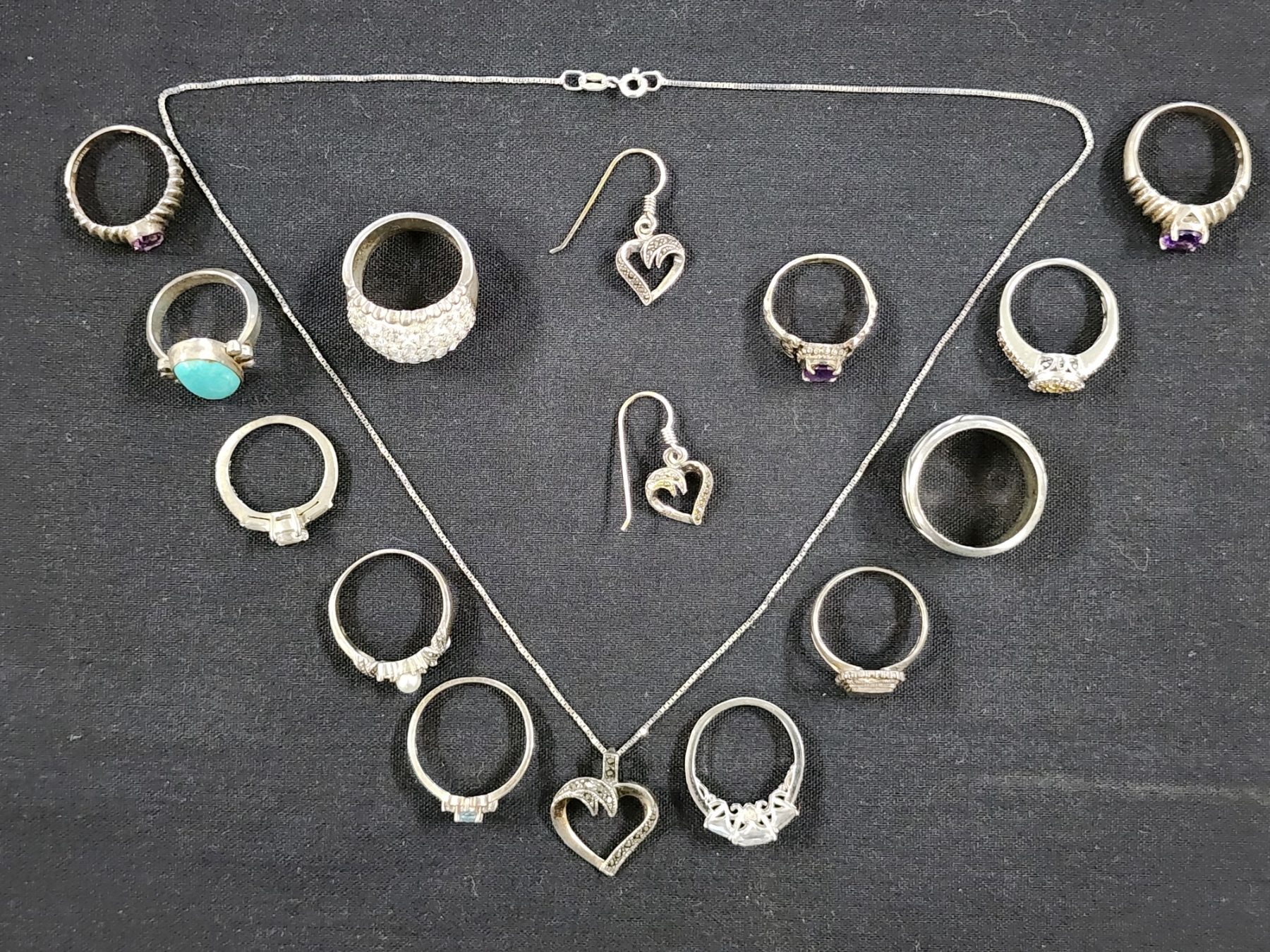 Sterling Silver Jewelry Assortment Featuring Necklace, Matching Earrings & Many Rings - Weighing About 61.2 Grams