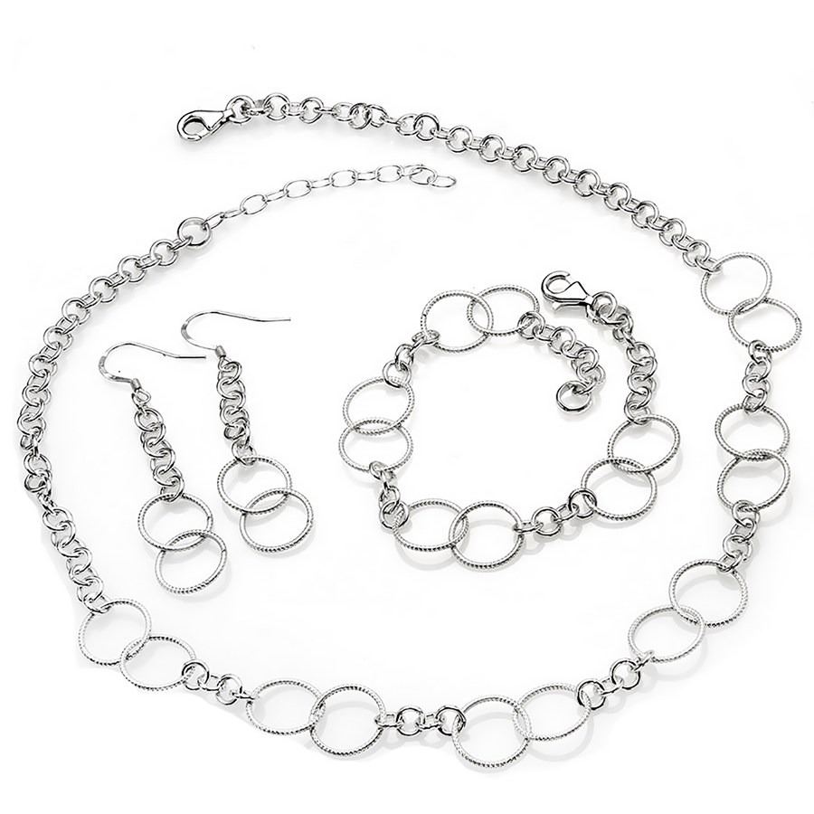 One Sterling Silver Jewelry Set. Comes with a Sterling Silver Necklace, Bracelet and Earrings.