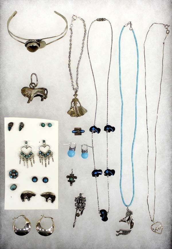 Sterling Silver Jewelry, Some Native American, includes 7 pairs of earrings, 2 single earrings, 2 pendant necklaces, cuff bracelet, fetish necklace, bracelet with matador dangle, small belt keeper, and 3 pendants, longest measures 17''L end to end (sterling chain)