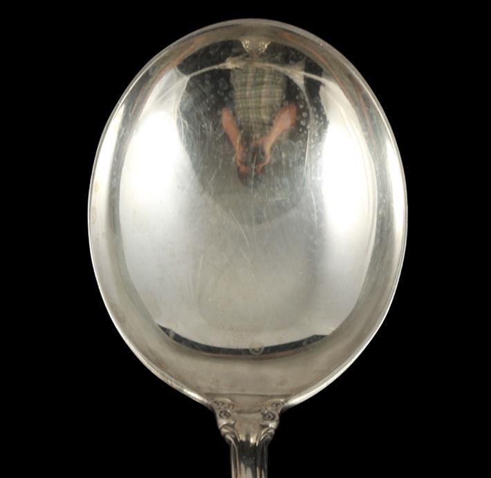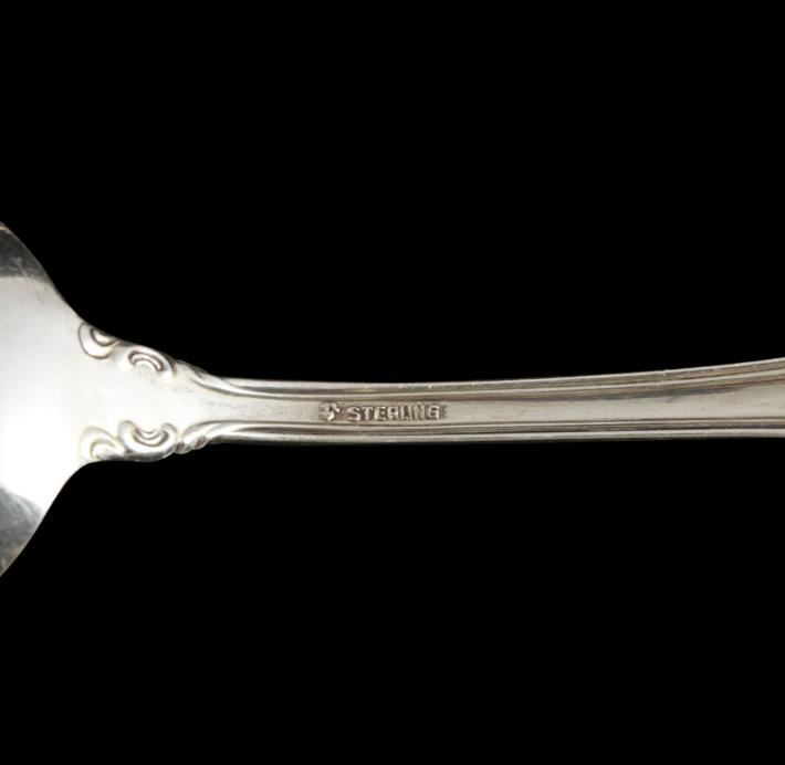 One set of "Joan of Arc" hallmarked sterling silver silverware c. 1940 featuring 23.50oz total of sterling silver in the 16 pc. set including: (7) gumbo soup spoons, (3) tablespoon serving spoons, and (5) flat paddle butter knives.