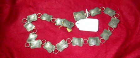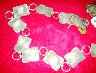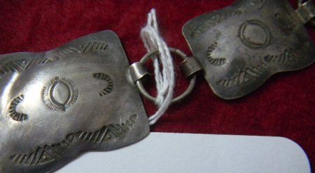 Sterling Silver Link Concho Belt from the 1940's. This belt has a stamped design and measures about 36 inch long. The belt buckle is about one and half by one and half. Each individual link is about one by one inches. Shipping $15.00 Good Condition. Sterling weighs