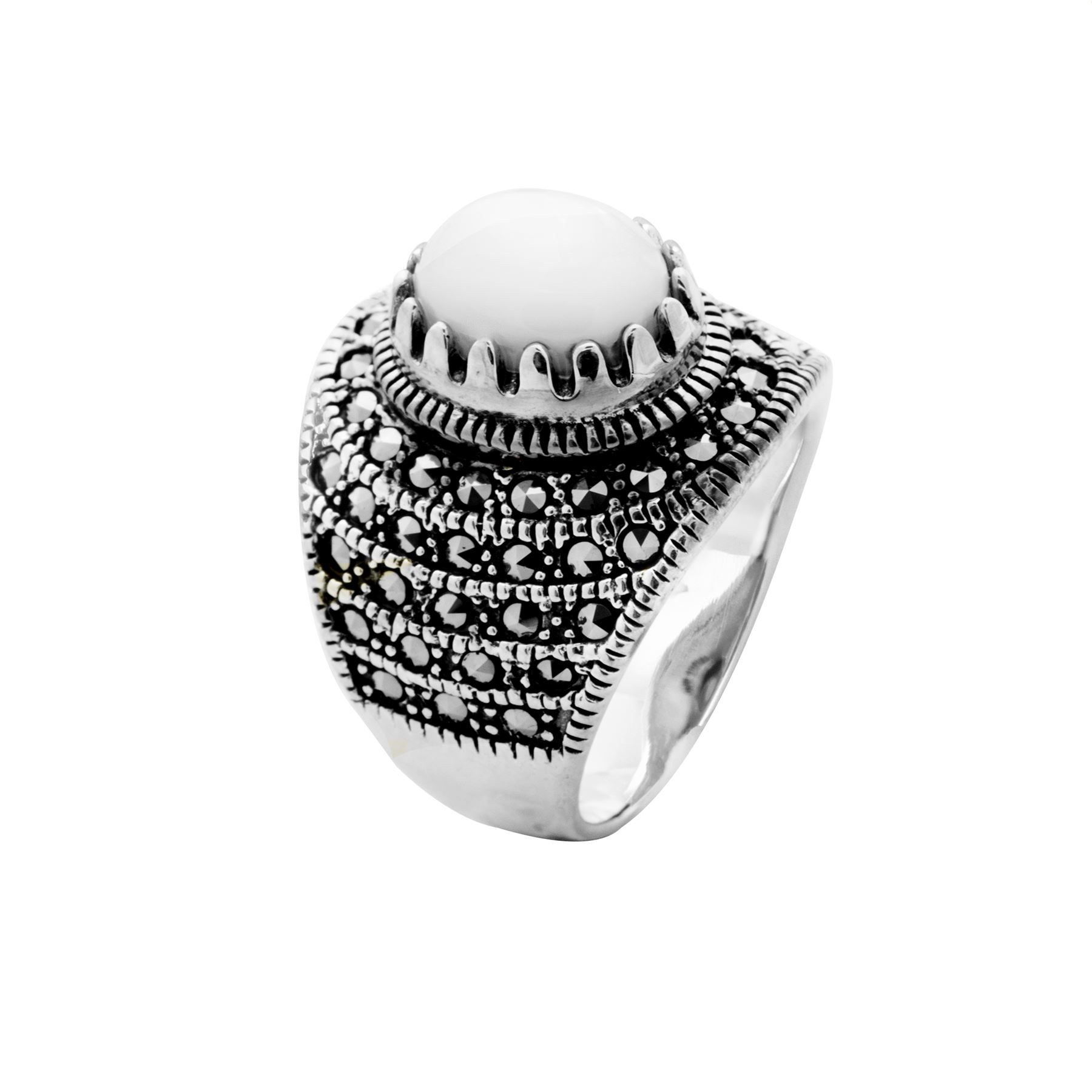 Addison Lane creates a beautiful statement ring from the Bora Bora Collection and adorns it with an impressive iridescent mother of pearl cabochon with genuine marcasite accents. Crafted in oxidized sterling silver, this is truly an eye-catching design.