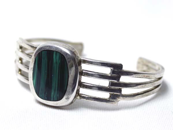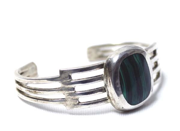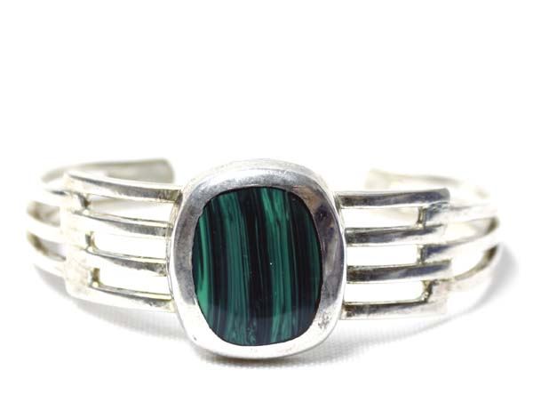 Sterling Silver Malachite Cuff Bracelet, all sterling silver set with a deep green banded malachite cabochon, vintage 1970's, no hallmarks, inside measures 6'' which includes opening x 1''W, 22.8g in total wt.