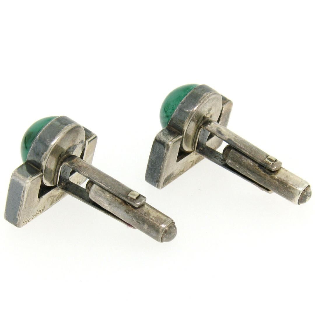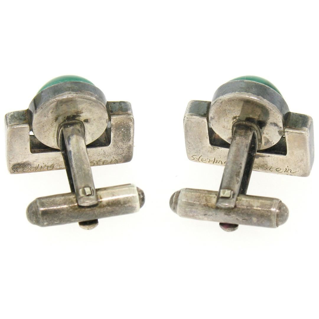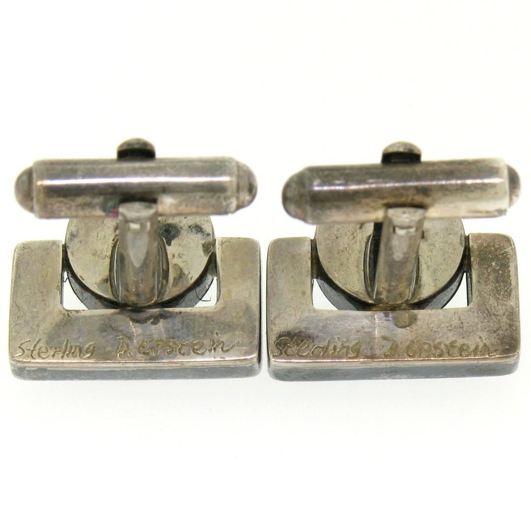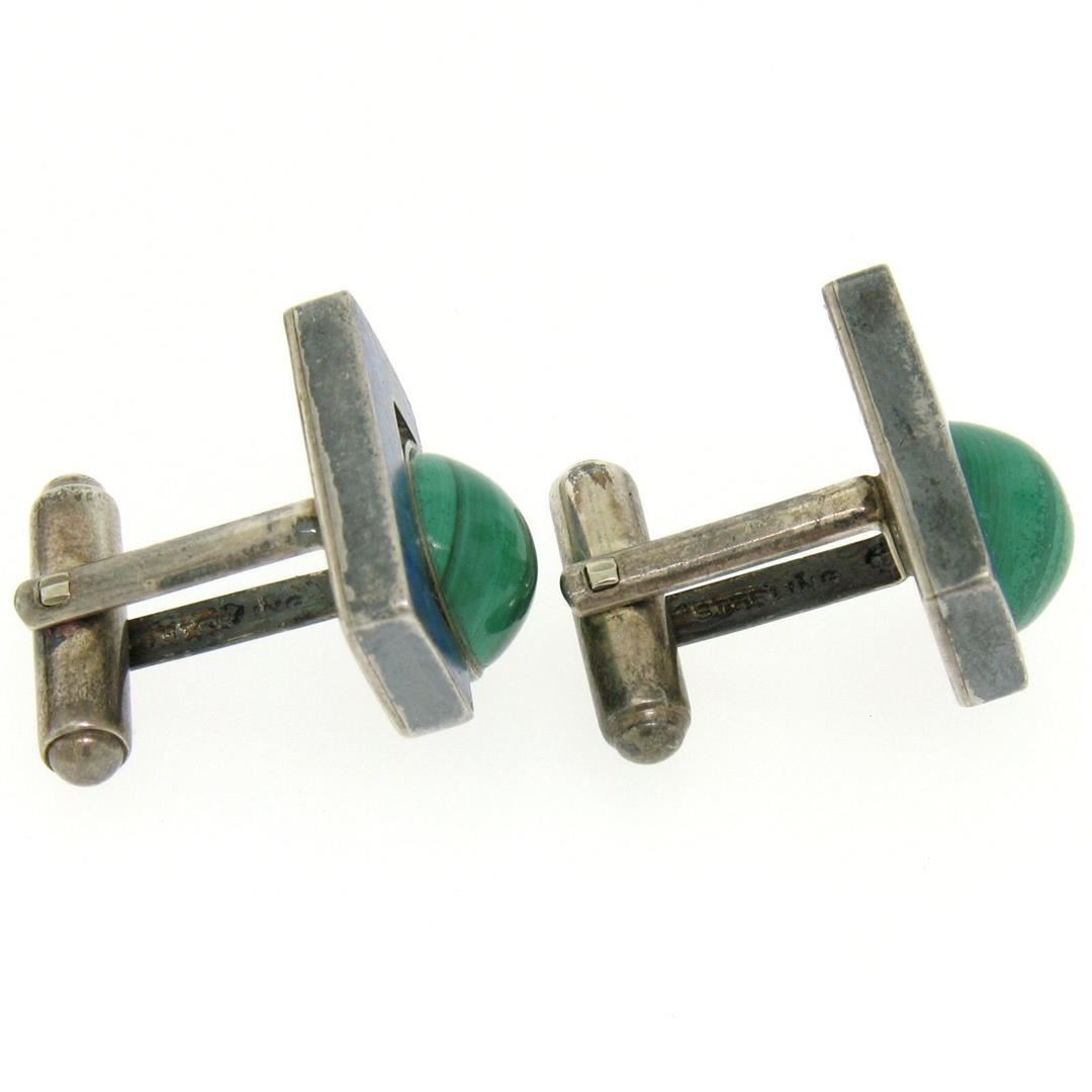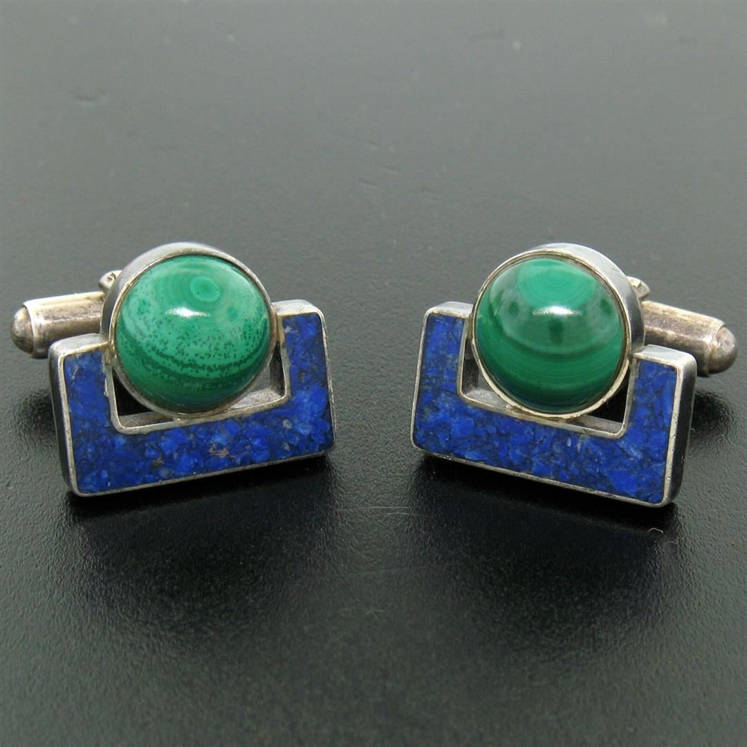 One Unique Vintage D. Epstein Sterling Silver Malachite & Lapis Swivel Cuff Links. Item Details: Material: Solid .925 Sterling Silver, Total Weight: 14.0 Grams, Stone(s): (2) Natural Genuine Malachite - Round Cabochon Cut - Bezel Set - Banded Green Color - 10.55mm (approx.), (2) Natural Genuine Lapis - Polished Square Mosaic Piece Bracket Shape - Blue Color w/ Natural Marbling, Overall Width: 18.95mm, Overall Height: 15.91mm, Overall Thickness: 23.62mm, Clearance: 11.45mm. Condition: Vintage designer piece. Tarnished w/ very minor wear from use. Excellent overall condition! Swivels are tight.