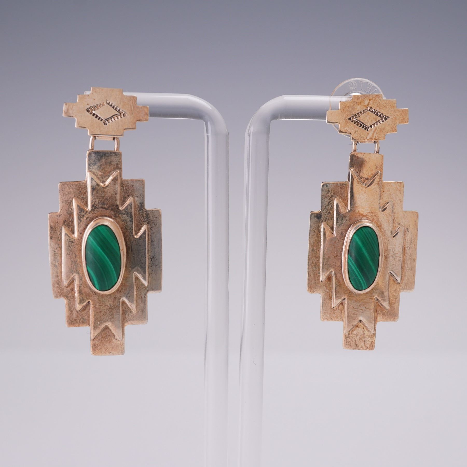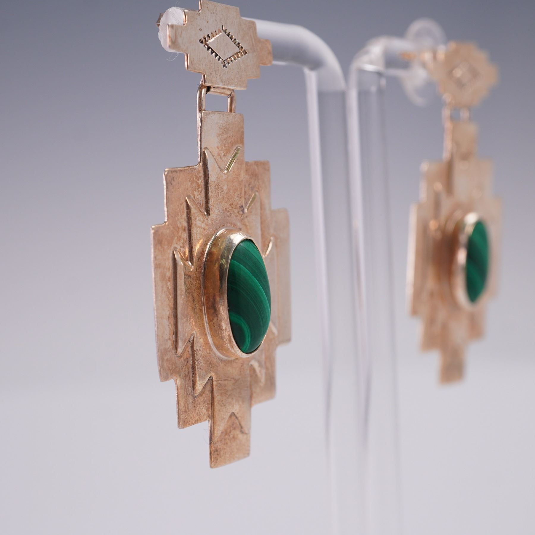 Pair of sterling silver earrings with post backs featuring a bold stepped-edge design and bezel-set green malachite cabochons. Reverse stamped with maker's mark and STERLING. Overall weight 0.5 oz.