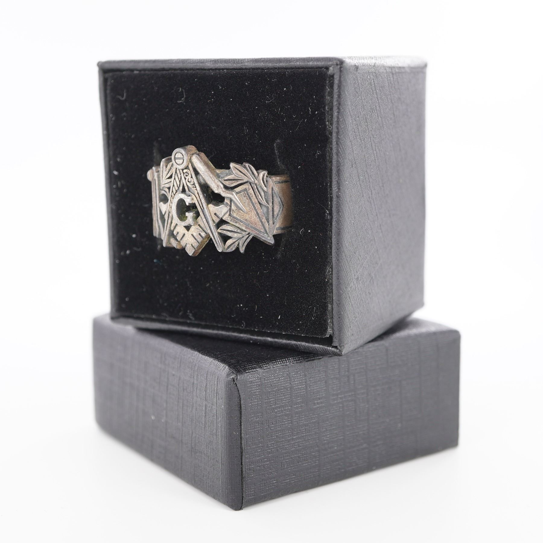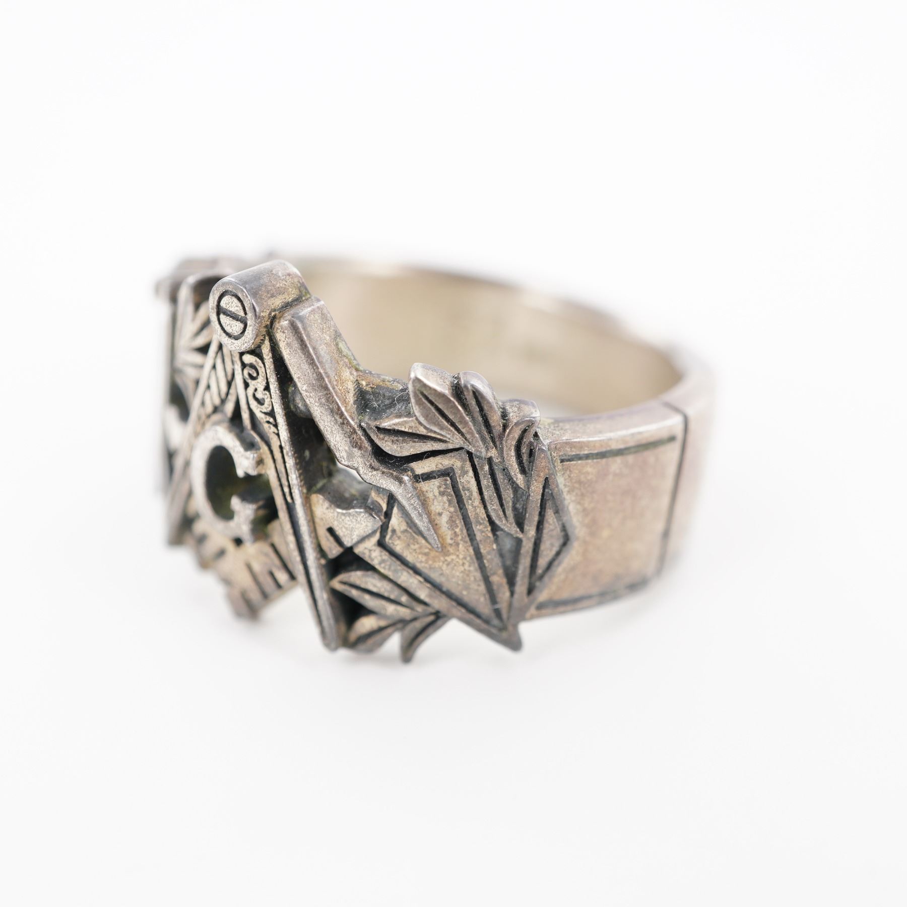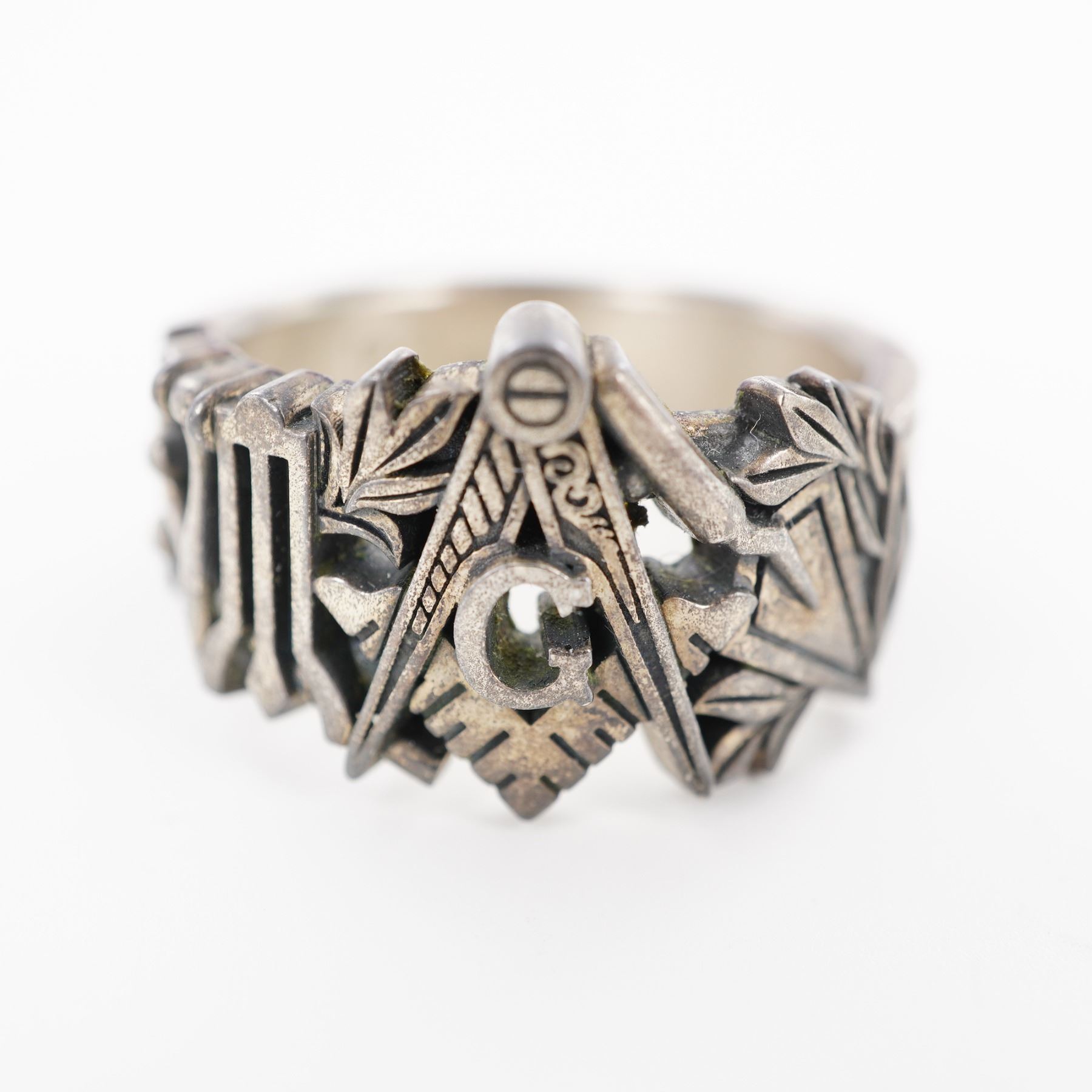 Sterling silver openwork band with a detailed square and compasses emblem centered around the letter G, framed by symbolic Masonic motifs including columns, leaves, and the all-seeing eye. Marked STER with maker's mark inside the shank. Weight: 11.2 g.