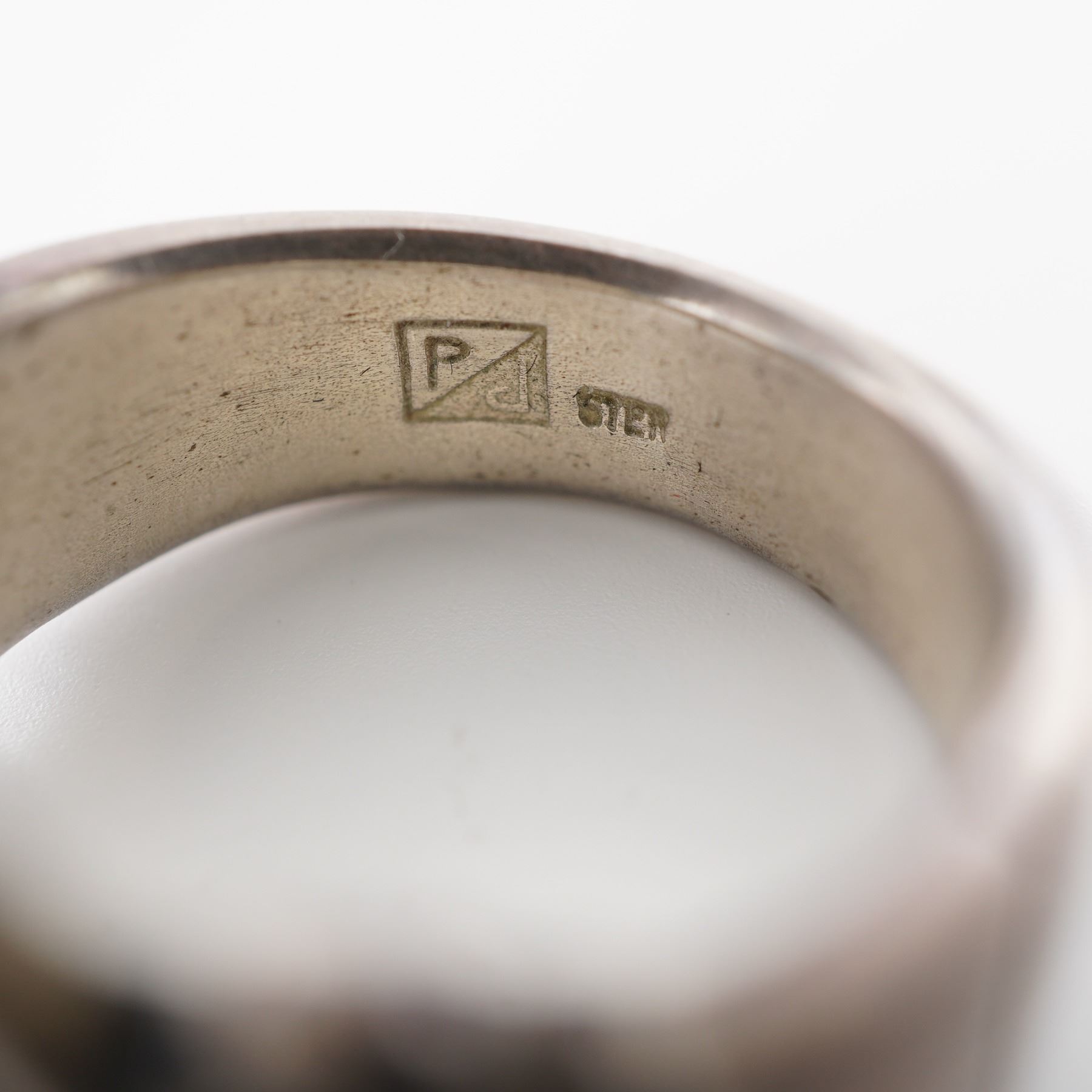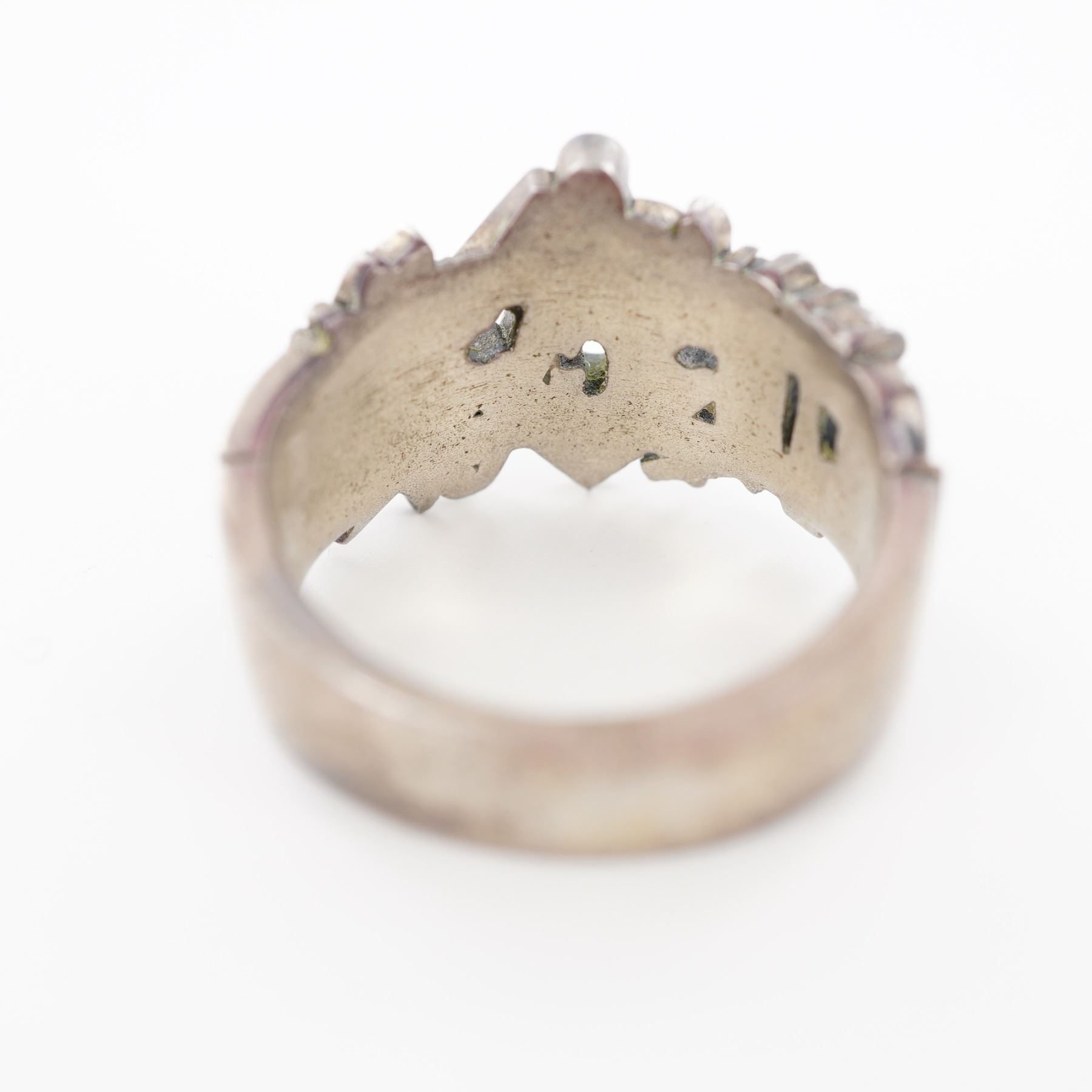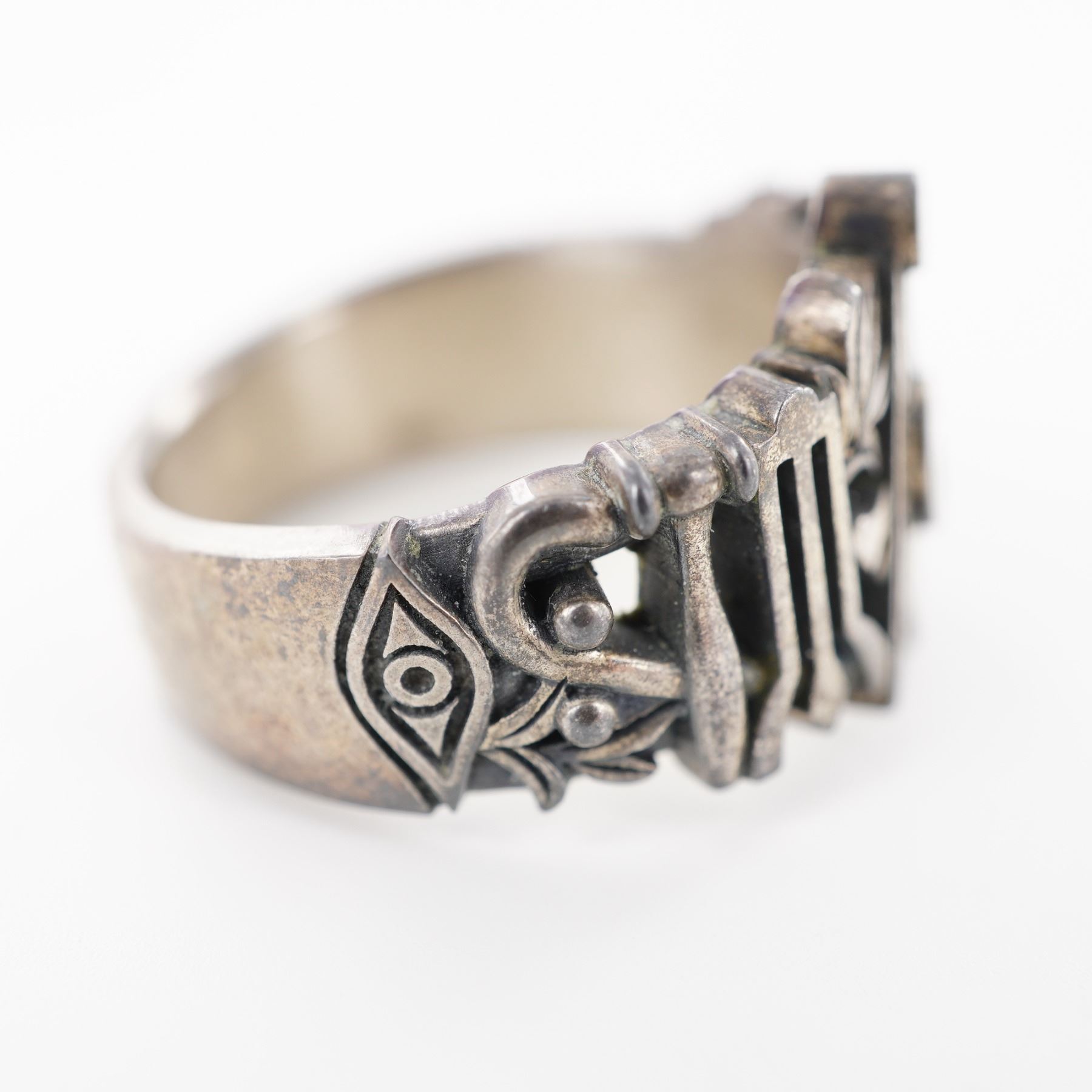 Sterling silver openwork band with a detailed square and compasses emblem centered around the letter G, framed by symbolic Masonic motifs including columns, leaves, and the all-seeing eye. Marked STER with maker's mark inside the shank. Weight: 11.2 g.