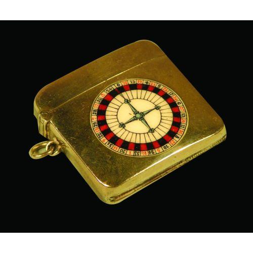Sterling Silver Match Safe with enameled roulette wheel. Excellent condition. 1 1/2 inches square.