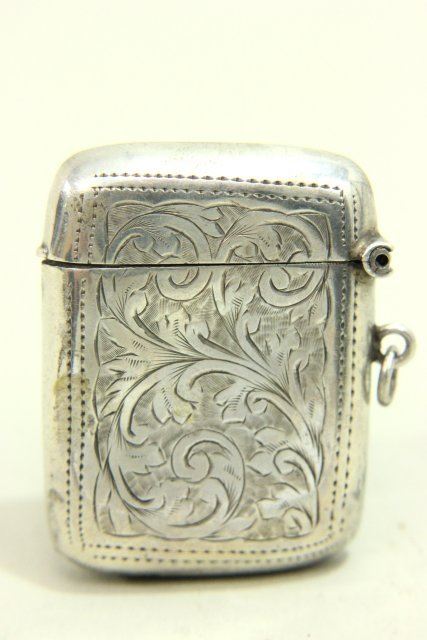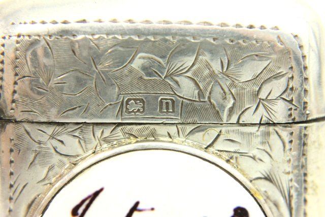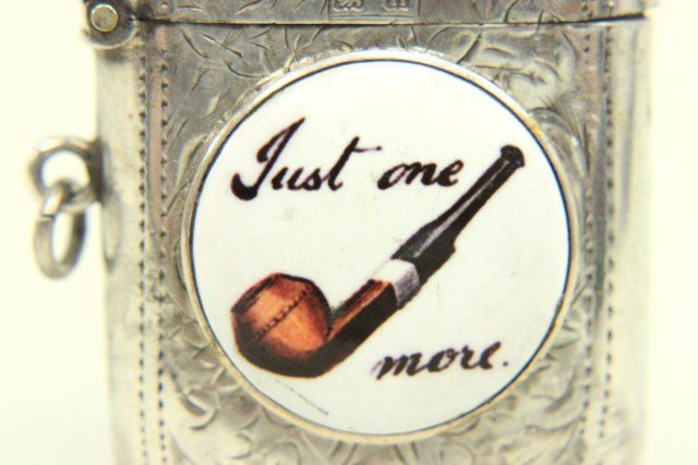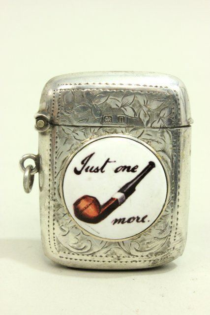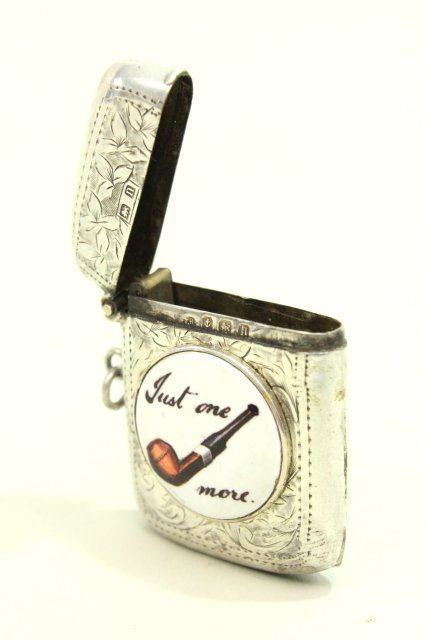 With porcelain plaque depicting pipe on the front. Approx. 1 7/8" H. Good condition.