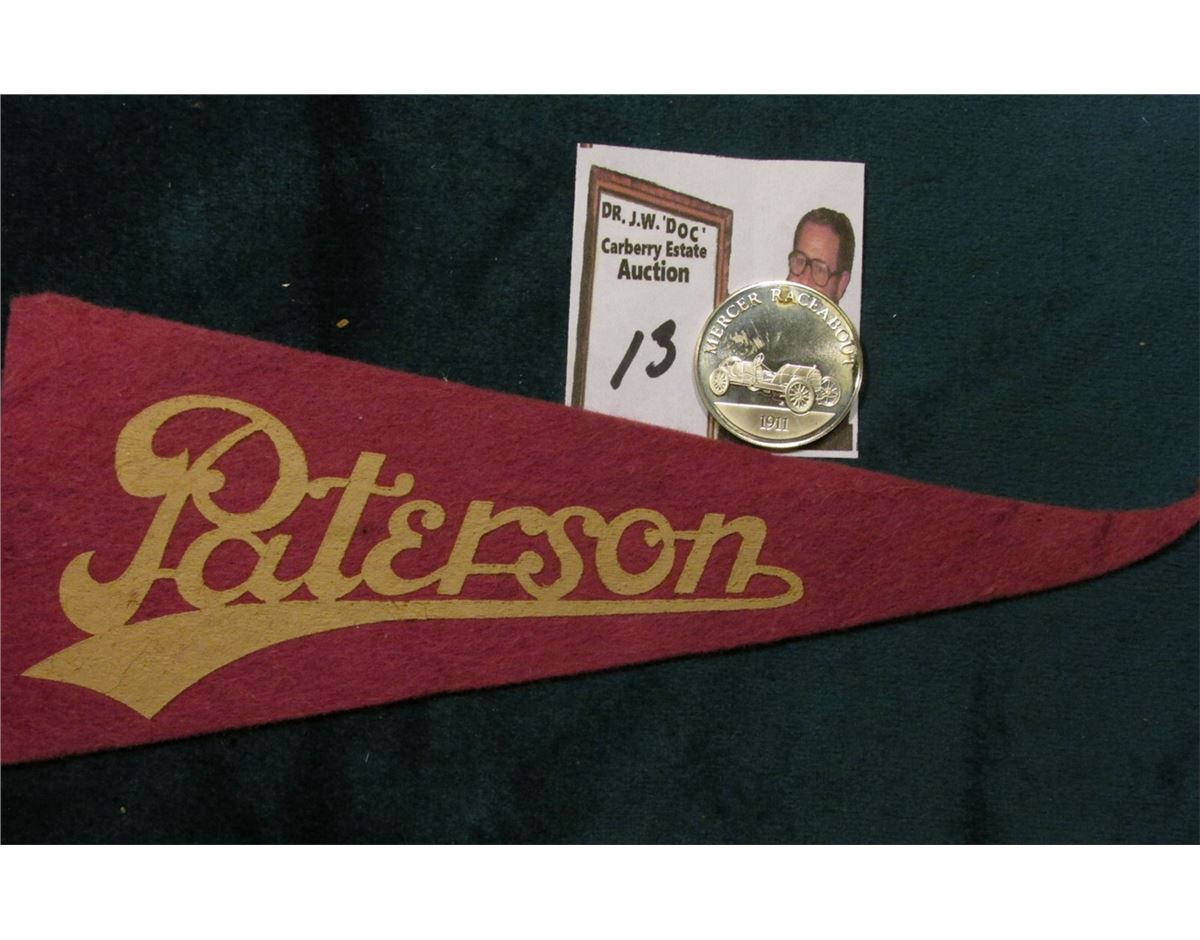 Sterling Silver Medal "1911 Mercer Raceabout", Proof, 26mm; & "Paterson" (Automobile) Felt Pennant Flag.