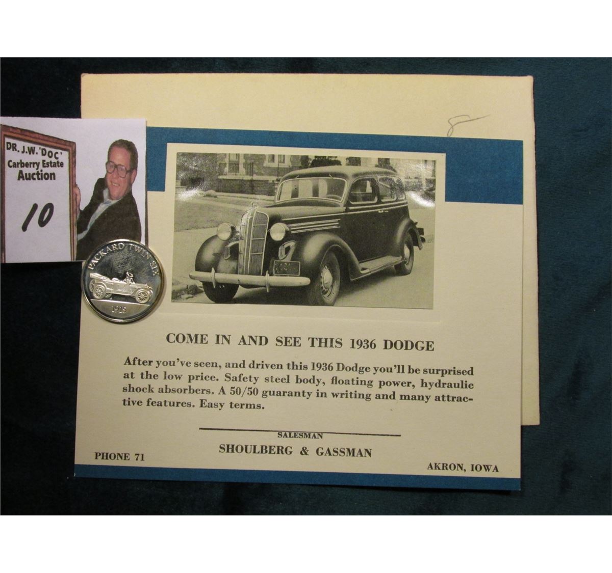 Sterling Silver Medal "1915 Packard Twin Six", Proof, 26mm; & an advertising Card "Come in and See this 1936 Dodge… Shoulberg & Gassman Akron, Iowa", (car depicted).