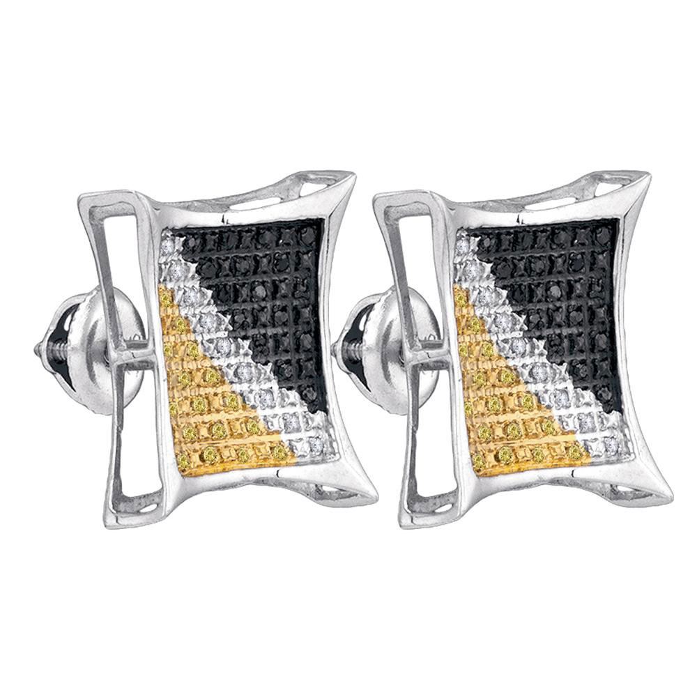 Sterling Silver Mens Round Black Yellow Color Enhanced Diamond Square Cluster Earrings 1/4 Cttw