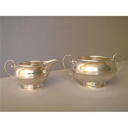 This Sterling silver Milk & Sugar is English and they were made in Birmingham in 1922.They have a very simple round form, with 3 bands going around the middle. They stand on a central pedestal foot.The quality and condition is good.Because of their neutral form they would combine very well with most teapots or china teaservices.