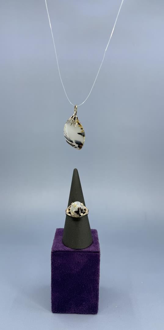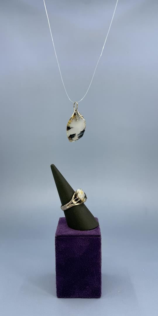 Pendant is 1 1/2" long. Ring size 9 1/2