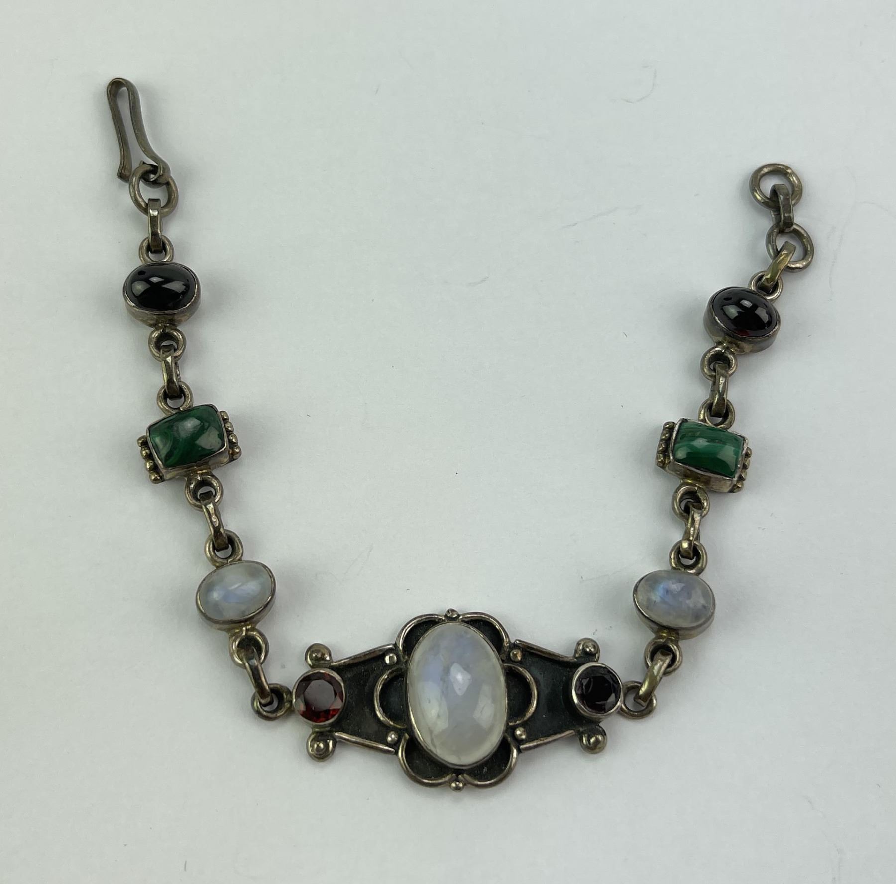 Moonstone, Malachite, and Jet. Set in Sterling Silver.