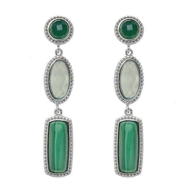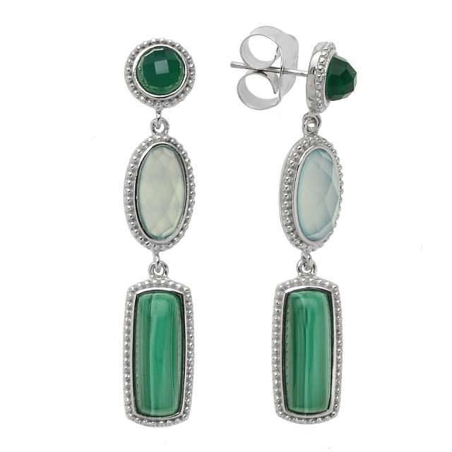 Pangea Mines beautifully juxtaposes shapes, colors and textures to create truly striking drop earrings. Beautifully crafted in gleaming rhodium over sterling silver, with genuine cushion cut malachite, oval cut green agate, and round cut seafoam chalcedony, this distinctive design will certainly brighten your day. Convenient butterfly backs complete the look.
