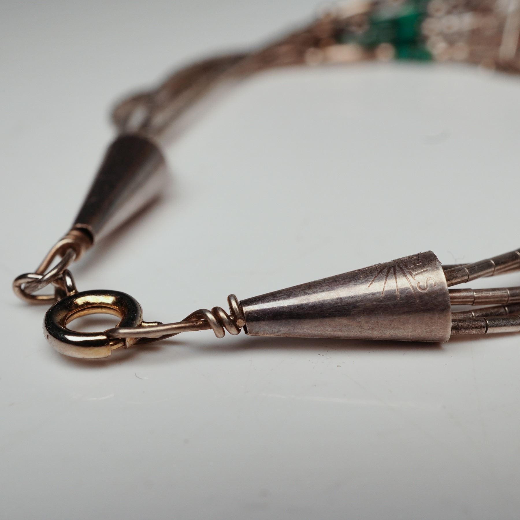 A vintage sterling silver bracelet marked 925 Sterling, designed with five strands of tubular and round silver beads interspersed with green malachite heishi beads. The center is set with an oval malachite cabochon in a scalloped bezel, framed by silver bead accents. Completed with tapered silver cone ends and a spring ring clasp. A bold bracelet with distinctive Southwestern style, likely Navajo craftsmanship. Weight: 7.31g.