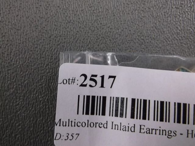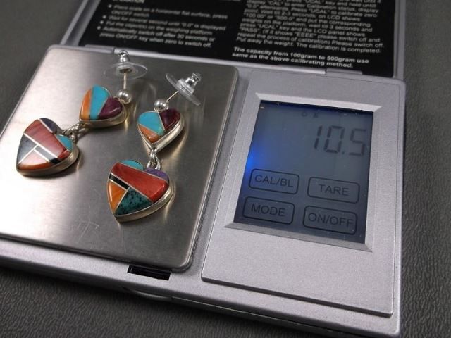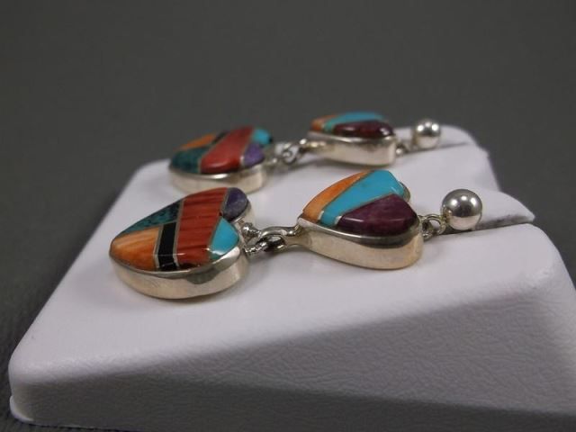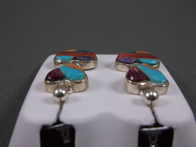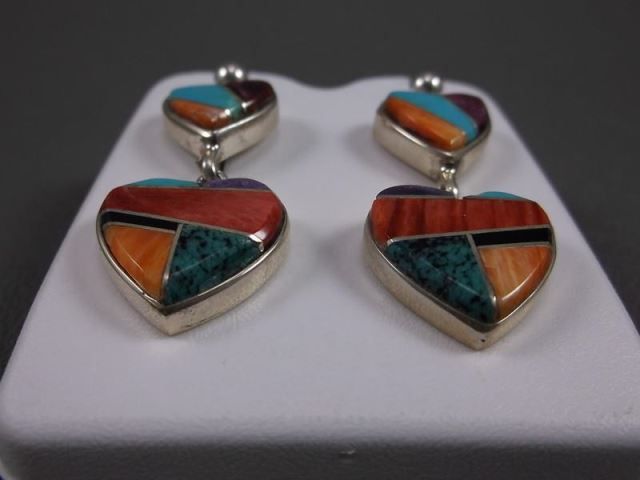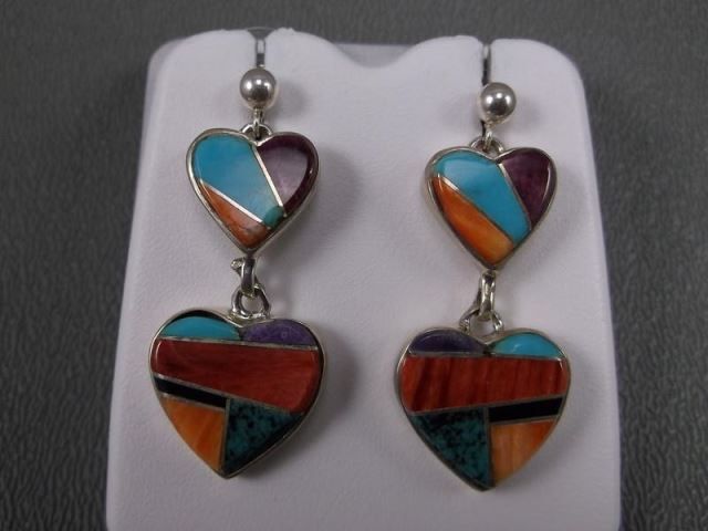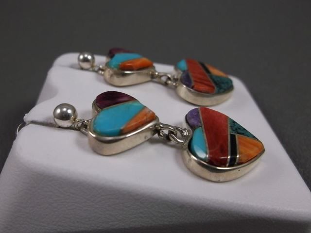 Sterling Silver Multi-color Inlay Heart Dangle Earrings, Marked Calvin Begay Weight: 10.5 Grams Reta