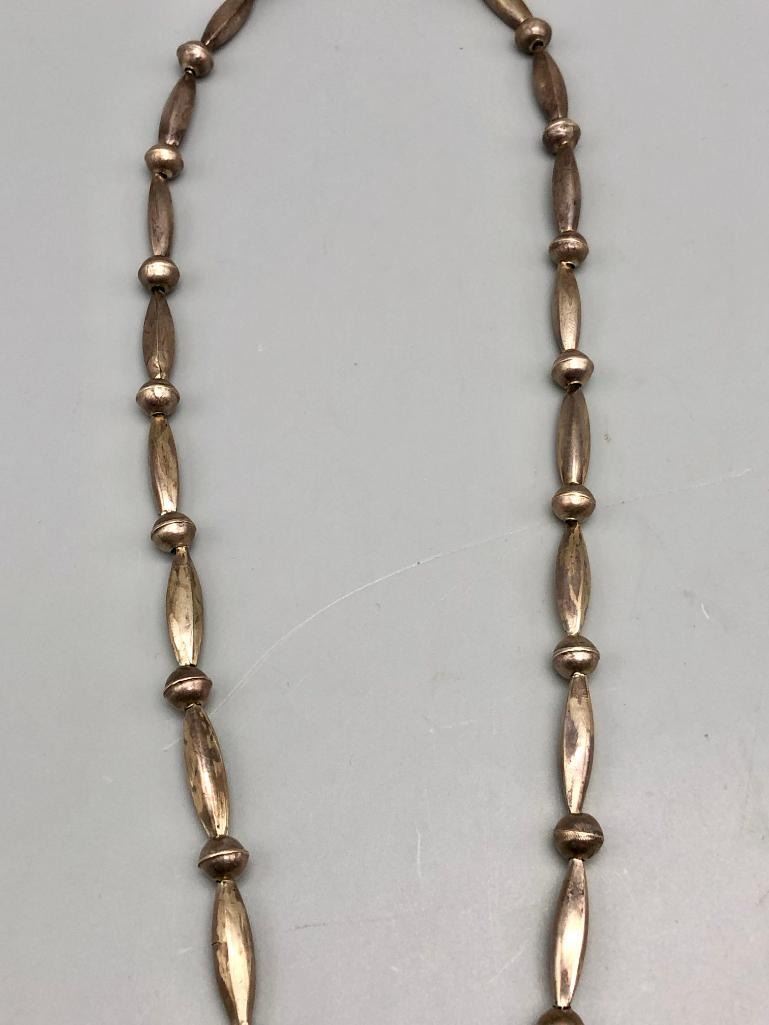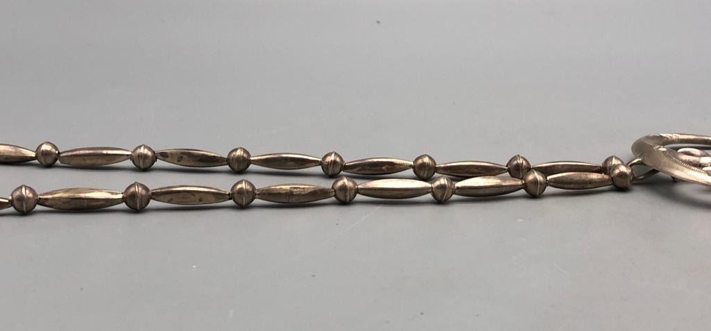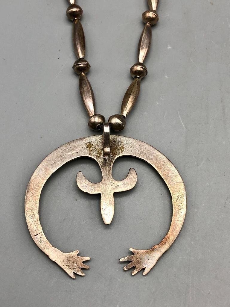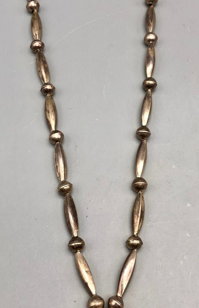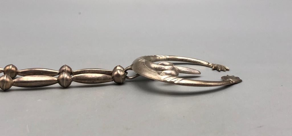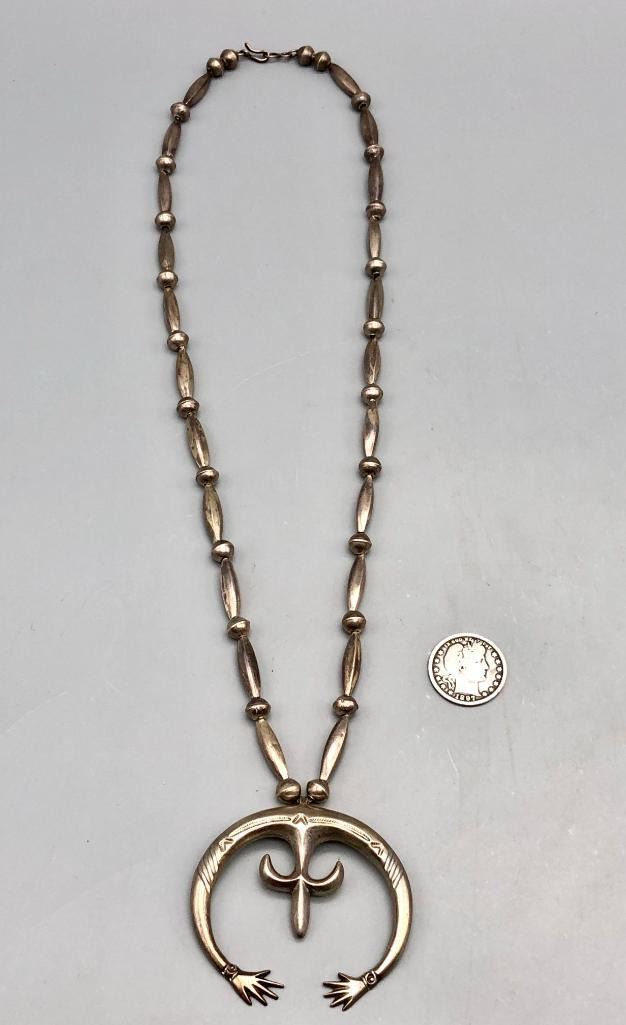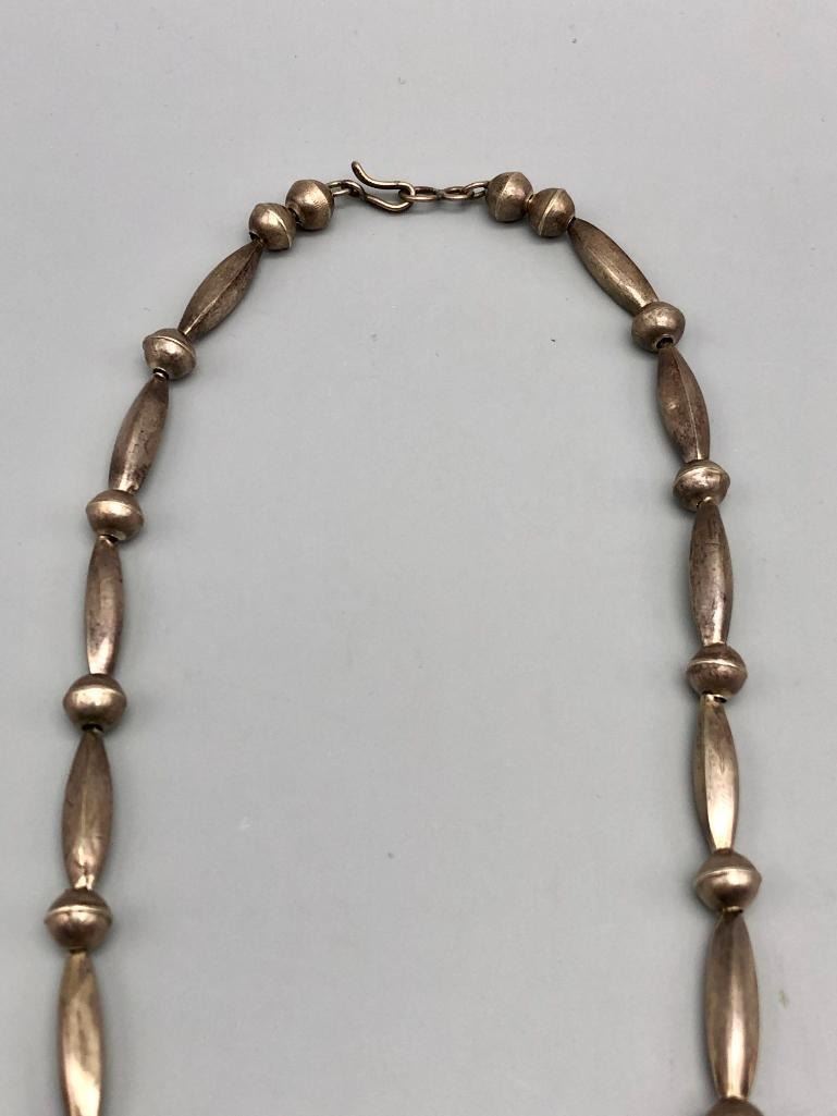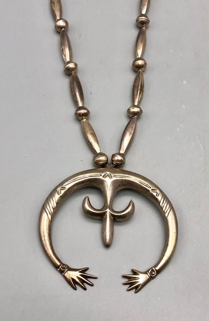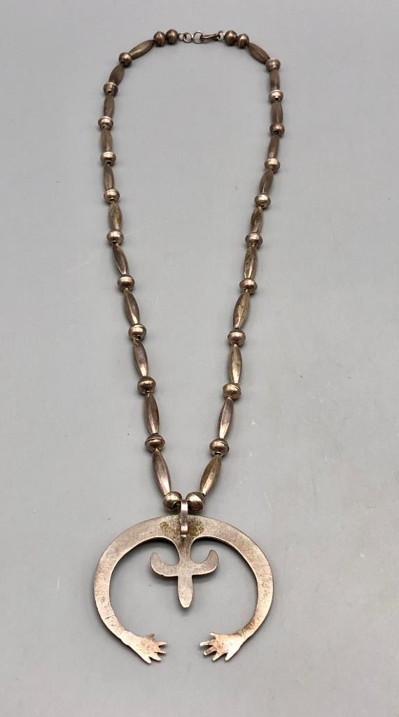 Offered for sale in this lot is a is great vintage sterling silver naja pendant necklace. This is a simple all silver necklace with a great sandcast naja that has a Shepard's hook that allows for easy removal. The necklace has a nice alternating pattern of beads and is strung on foxtail chain. It is made from sterling silver. MAKER: Unmarked. APPROX AGE: Circa 1970s. SIZE: Fits a 26 inch neck. Pendant measures 2-3/8 inches long X 2-1/2 inches wide. Weighs 45.3 grams. CONDITION: Good for its age, normal wear expected. Please look closely at the pictures as they are an important part of our description and are hereby incorporated into the description, specifically with regards to condition. SHIPPING: There will be a $5 handling / packaging fee for shipping this lot. The actual cost of postage will be added on top of that. BUY IT NOW: If you would like to buy this item now, without waiting for the auction day to bid on it, we do offer this option (which is available up to 48 hours before the actual auction starts). The “Buy it Now†price is the high estimate of this lot (plus applicable fees and the Buyer's premium is discounted to 10% when using the Buy it Now option). If you would like to exercise this option, you must contact us by email (or phone as long as you talk to someone live). Reference this lot number and your intention to "Buy it Now."