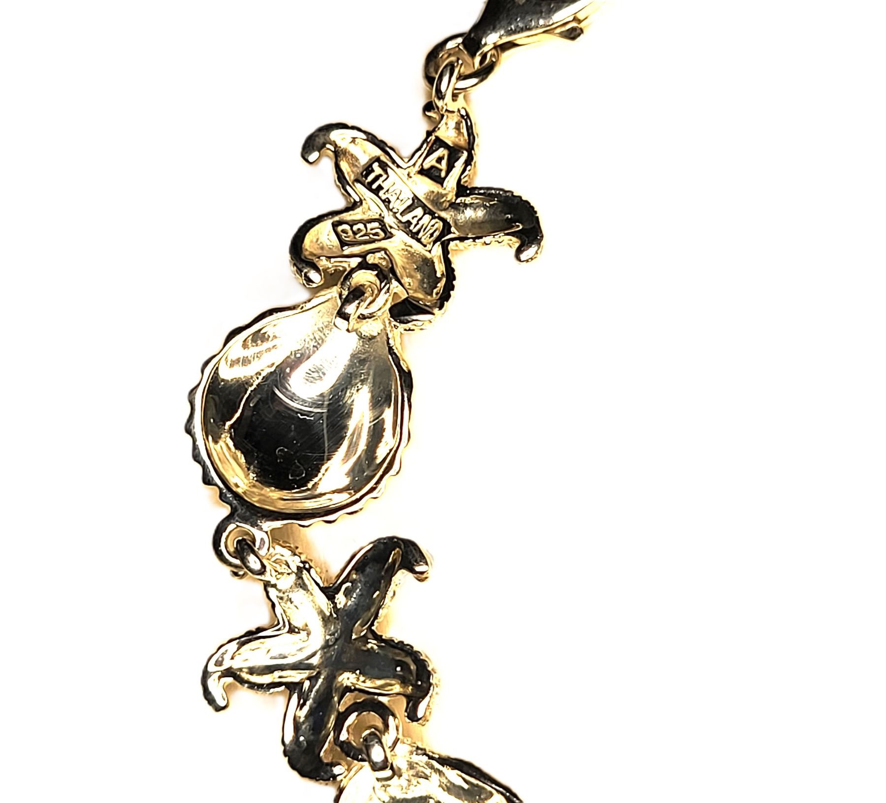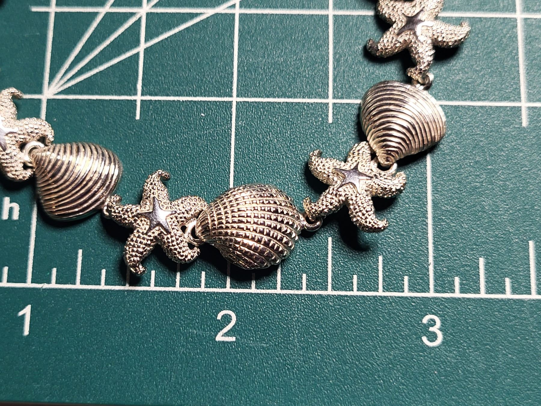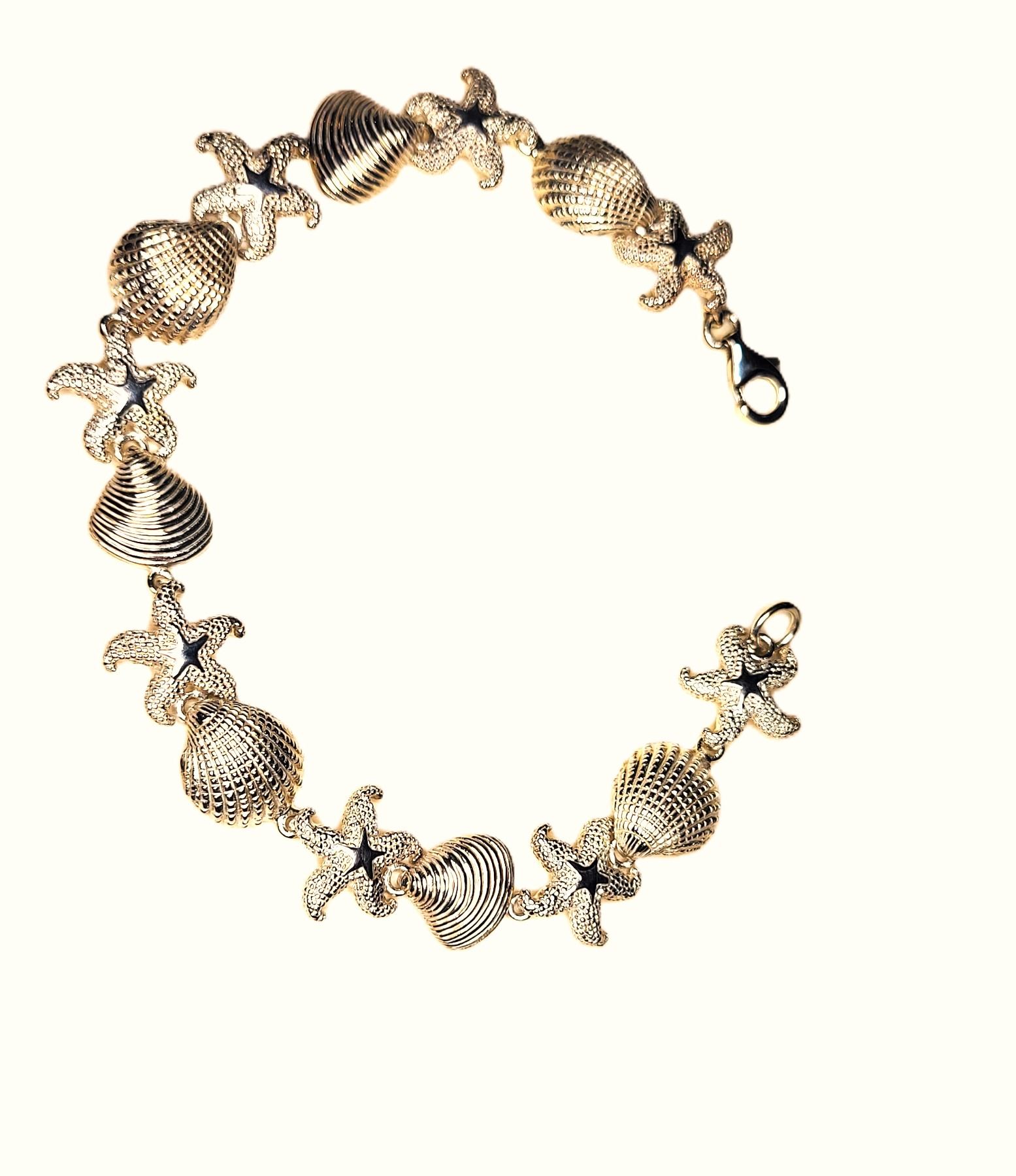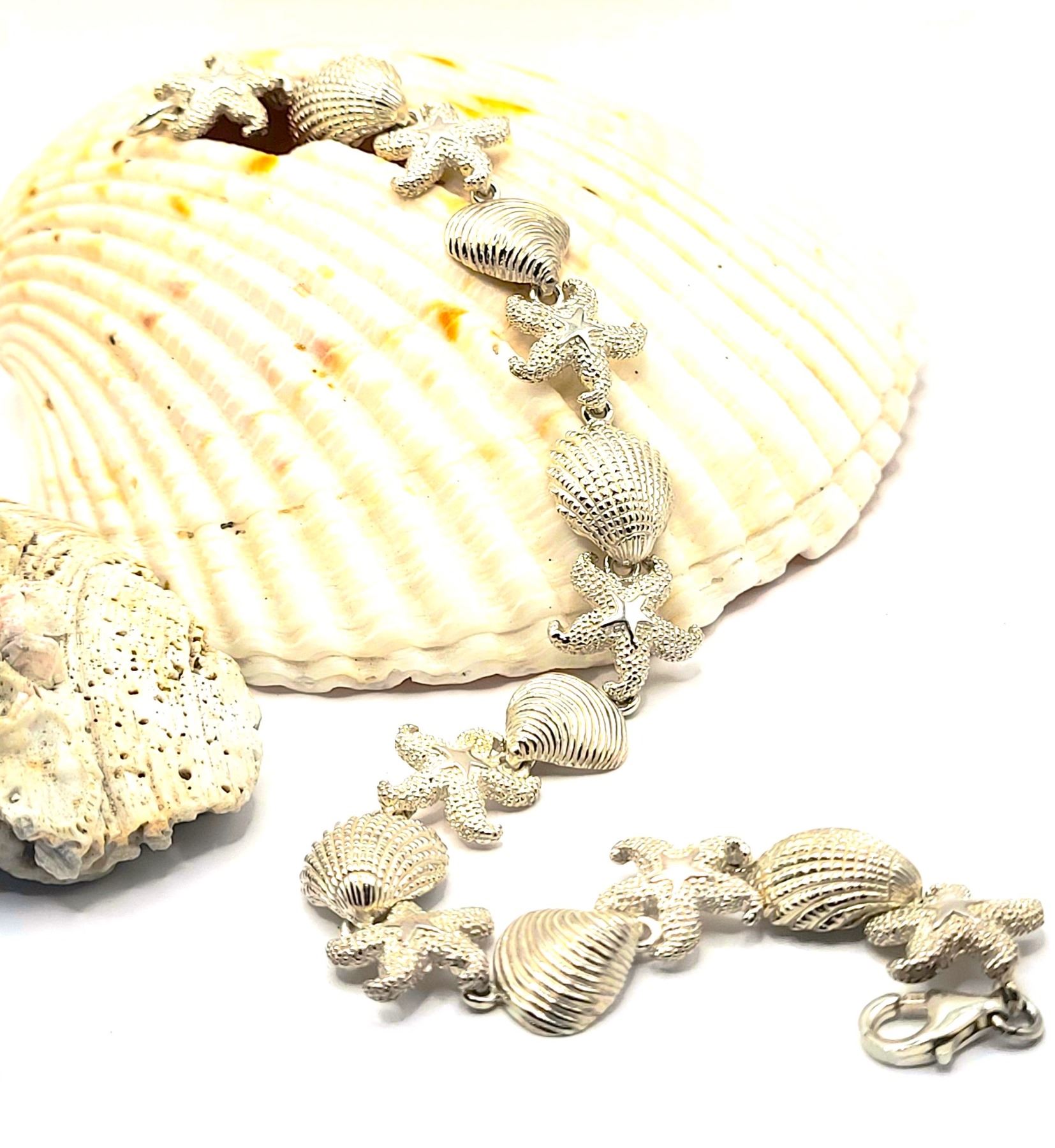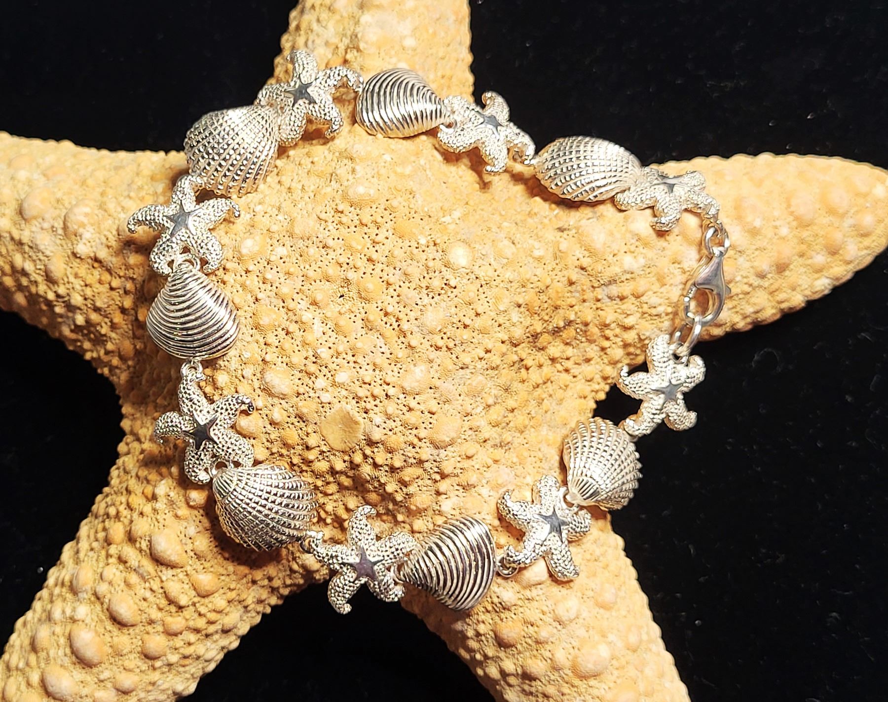 Your wrist will be wrapped in paradise with this sterling silver (.925)& nbsp; bracelet that shows off some of the best souvenirs the beach as to offer!& nbsp; Seashells and starfish are linked together end to end for 8& quot; and they latch with a lobster clasp. Admin: 33121/8br