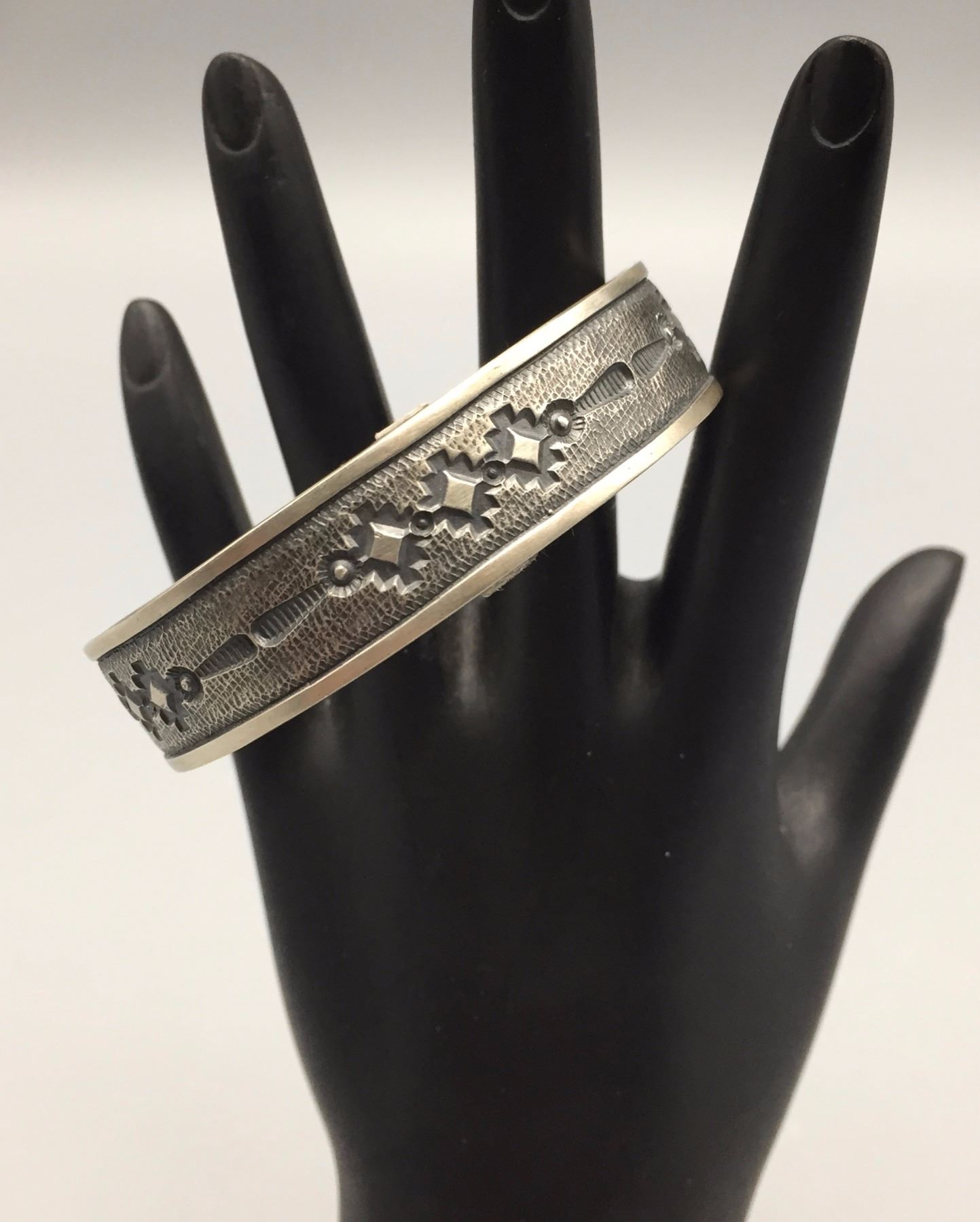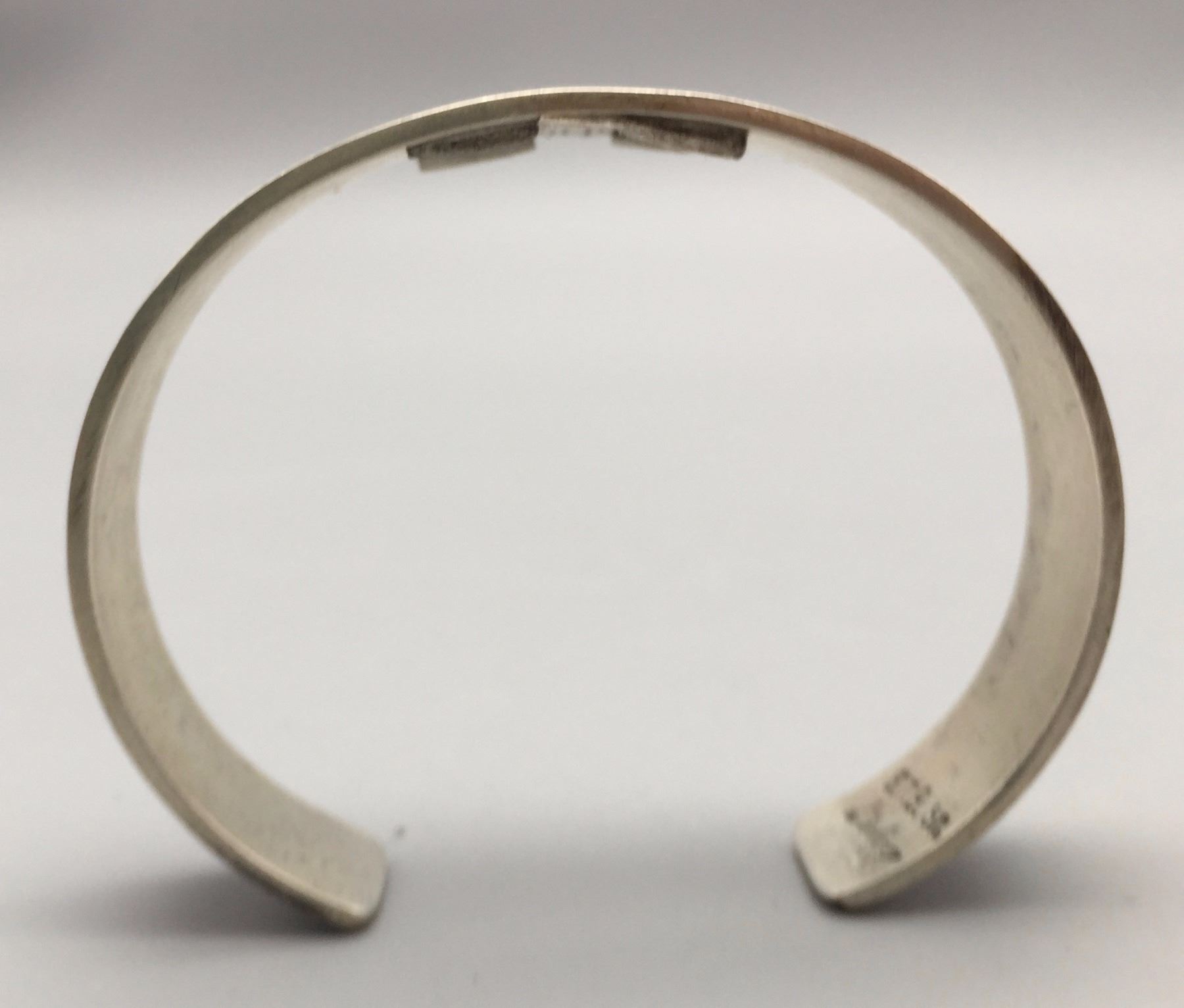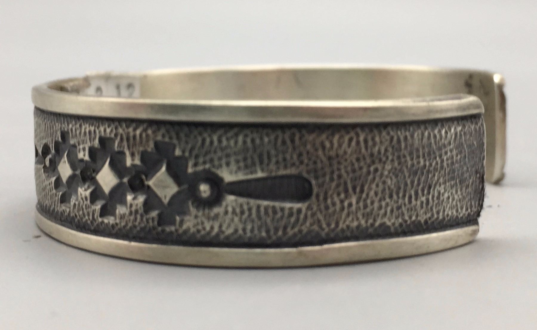 Maker: Ernest Bilagody, Navajo. Approx. Age: Fairly Modern. Size: Inside circumference 5 1/2” with an additional 1” opening (fits 6 1/2” wrist). about 5/8” at it’s widest and weighs 27.2 g. Additional Info: Stamped sterling silver cuff bracelet by Ernest Bilagody. Condition: Good, normal wear expected. New, old stock (NOS). Please look closely at the pictures - they are an important part of our description. Shipping: There will be a $5 handling / packaging fee for shipping this lot. The actual cost of postage will be added on top of that.