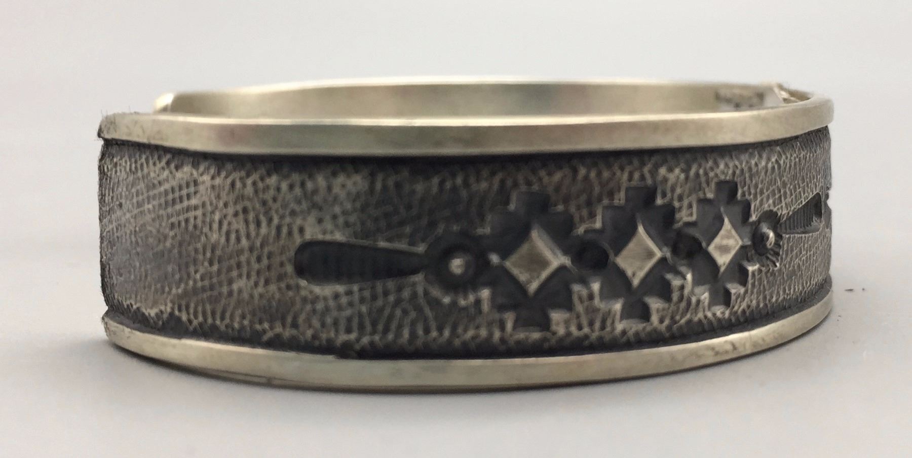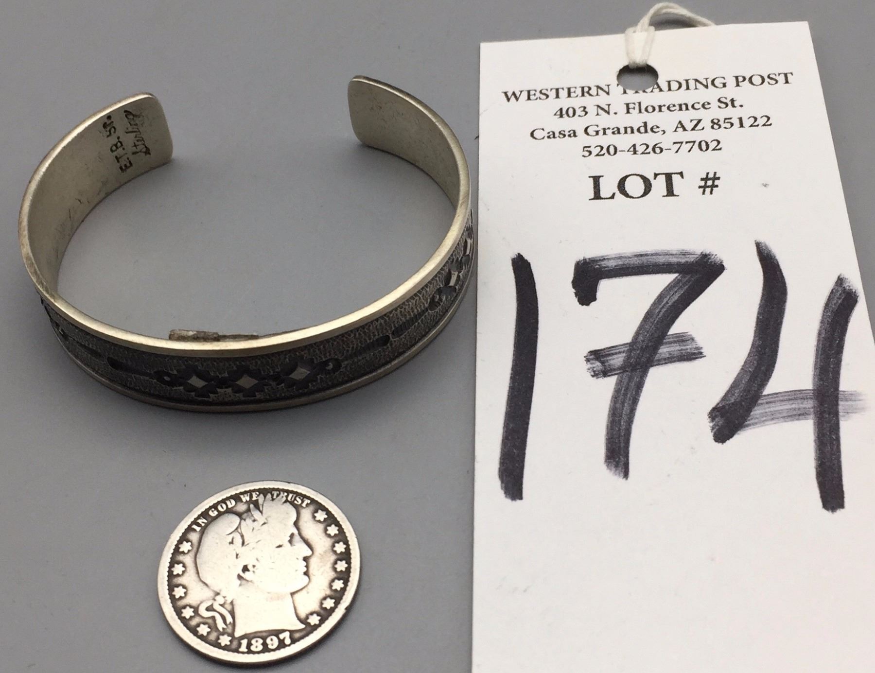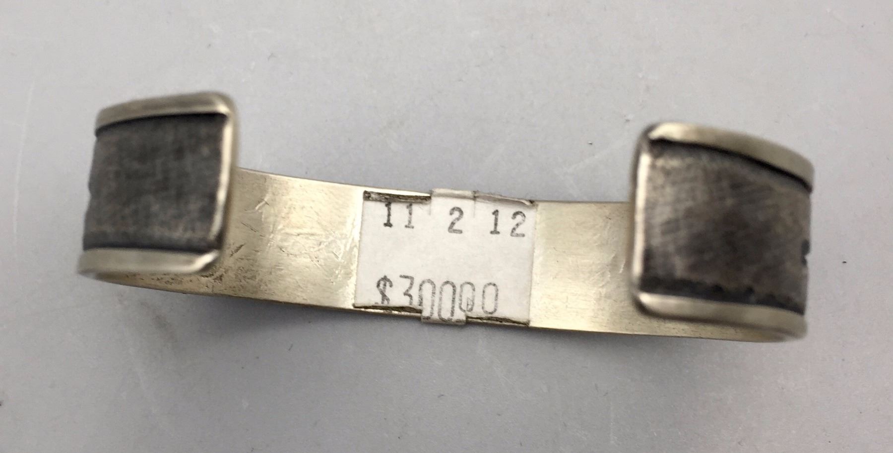 Maker: Ernest Bilagody, Navajo. Approx. Age: Fairly Modern. Size: Inside circumference 5 1/2” with an additional 1” opening (fits 6 1/2” wrist). about 5/8” at it’s widest and weighs 27.2 g. Additional Info: Stamped sterling silver cuff bracelet by Ernest Bilagody. Condition: Good, normal wear expected. New, old stock (NOS). Please look closely at the pictures - they are an important part of our description. Shipping: There will be a $5 handling / packaging fee for shipping this lot. The actual cost of postage will be added on top of that.