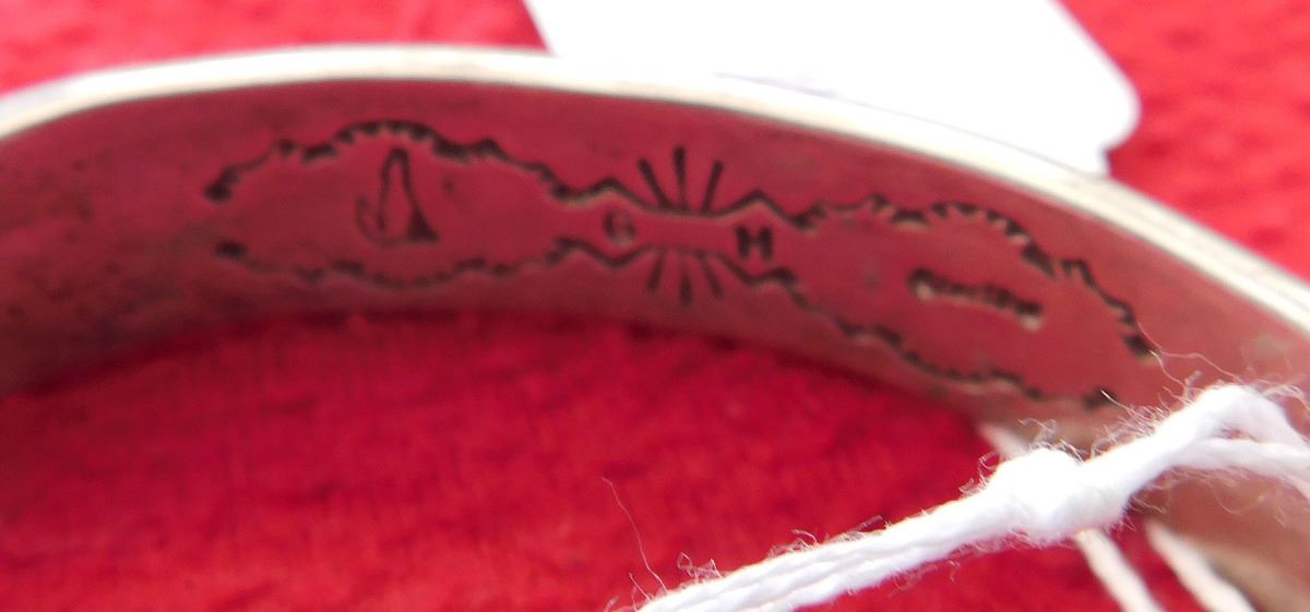 Sterling Silver & Navajo Bracelet, circa 1960s. Made of sterling silver, the item has a 5.25" inside measurement with a 1.25" opening. Navajo, signed G.H. Nice design inside and out! Weighs approx. 49.2 grams. Condition: Good, see images. Shipping: $18.50 w/insurance and signature.